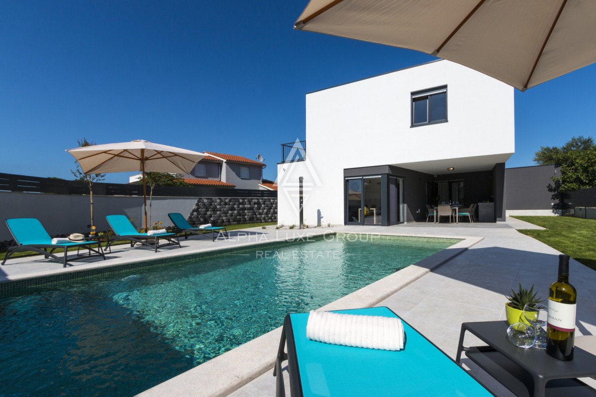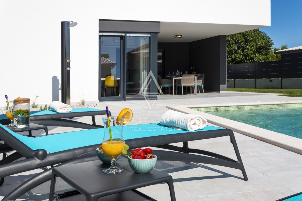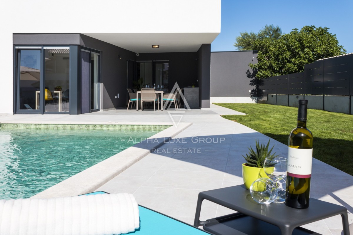 Ta moderna vila naprodaj na obrobju Pule ponuja idealno kombinacijo udobja, zasebnosti in sodobnega dizajna. Nahaja se v mirnem stanovanjskem predelu, le nekaj minut od naravnih plaž in mestnega središča. Vila nudi 160 m² bivalnih površin, razporejenih na dveh etažah. V pritličju se nahaja vhodna veža s predvidenim prostorom za garderobo, prostorna dnevna soba z velikimi steklenimi stenami, ki povezujejo notranjost z urejenim vrtom, bazenom in letno kuhinjo, ter moderna ločena kuhinja z jedilnico, ki se odpira na pokrito teraso. Na tej etaži sta tudi stranišče za goste ter velika shramba s tehničnim prostorom.
