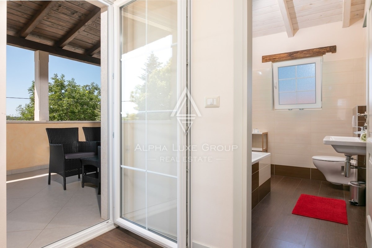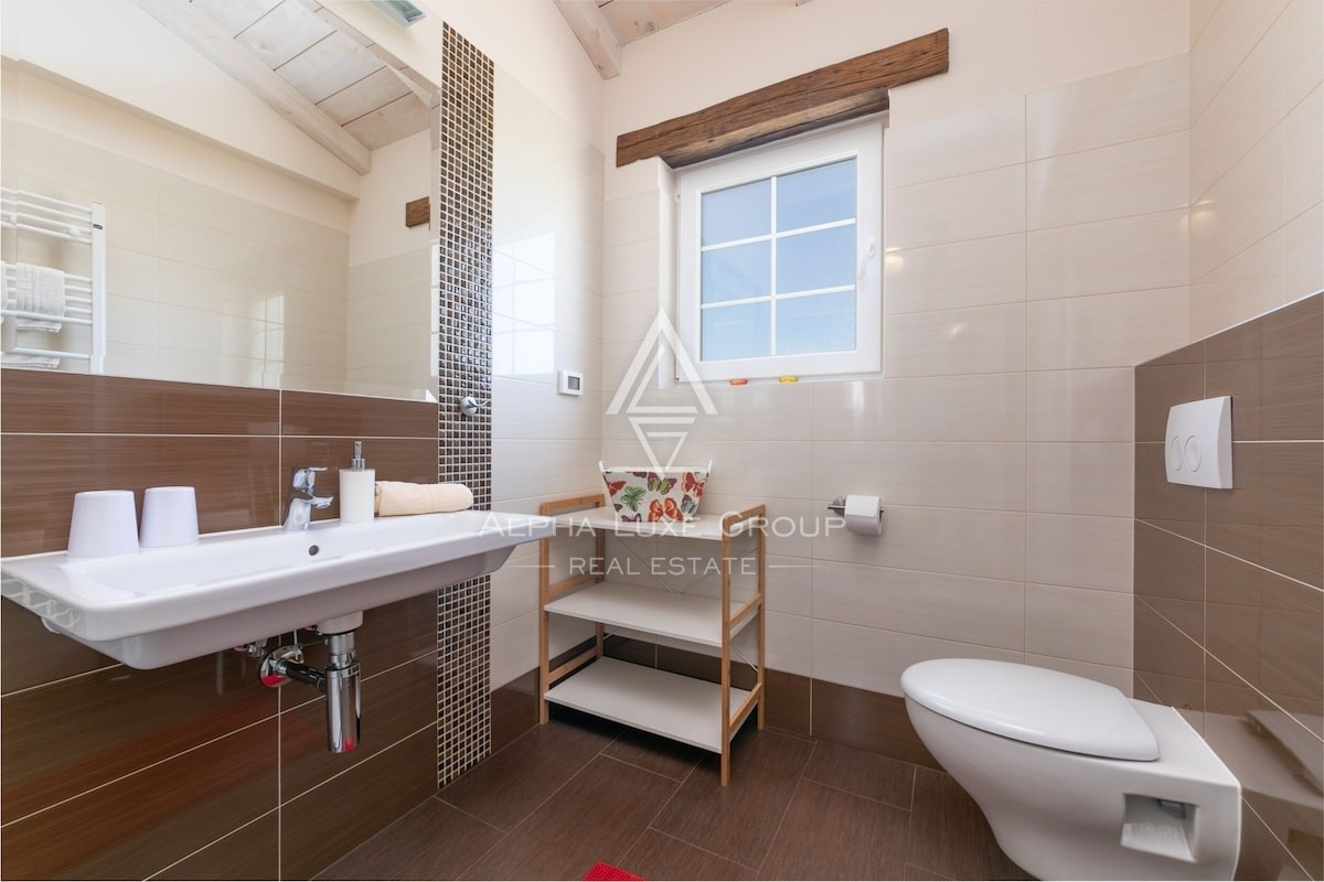 V nadstropju sta dve udobni spalnici, vsaka z lastno kopalnico. Ena izmed spalnic ima dostop do velike pokrite terase z odprtim pogledom na naravo in mirno okolico.