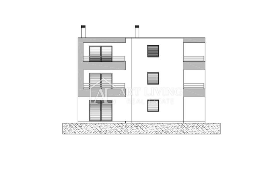 Stanovanje velikosti 66,84 m2 obsega predsobo, dnevno sobo z odprto kuhinjo in jedilnico, dve spalnici in kopalnico. Dnevna soba vodi neposredno na pokrito teraso 6,10 m2 s pogledom na istrsko pokrajino.