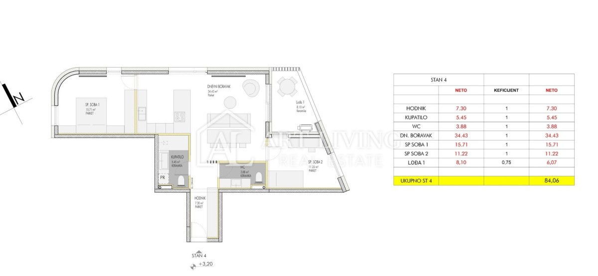 Stanovanje s skupno neto uporabno površino 84,06 m2 je sestavljeno iz predsobe, dnevne sobe z odprto kuhinjo in jedilnico, dveh spalnic, kopalnice in wc-ja ter lože s čudovitim pogledom na istrsko pokrajino. .