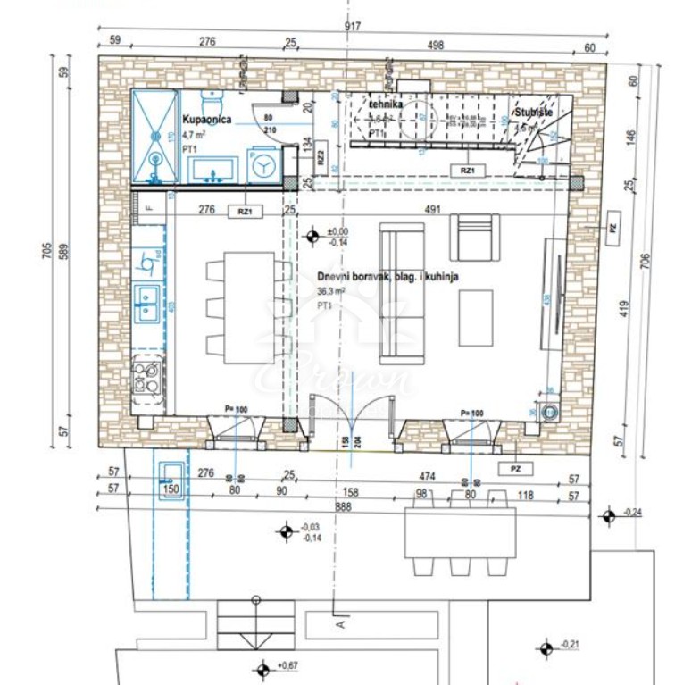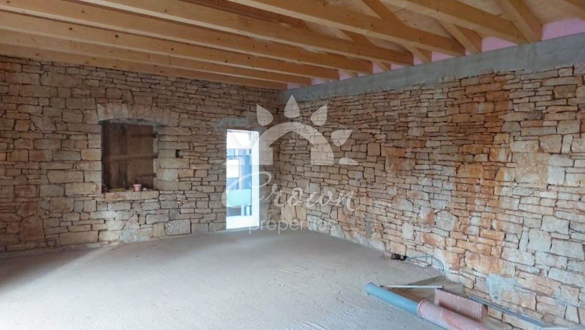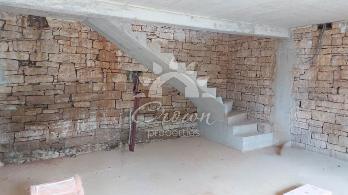 Naprodaj je hiša v napredni fazi gradnje (roh-bau) z veljavnim gradbenim dovoljenjem in prijavljenim začetkom gradnje. Izvedena je armiranobetonska temeljna plošča ter armiranobetonska medetažna konstrukcija z betonskimi stopnicami. Postavljena je nova lesena strešna konstrukcija z vsemi potrebnimi sloji, kot končna kritina pa je uporabljen mediteranski strešnik. V pritličju je zgrajena predelna stena za WC. V skladu s projektom so izvedene štiri nove odprtine z vgradnjo originalnih kamnitih okvirjev na zunanji fasadi, s čimer je ohranjen avtentičen videz objekta.