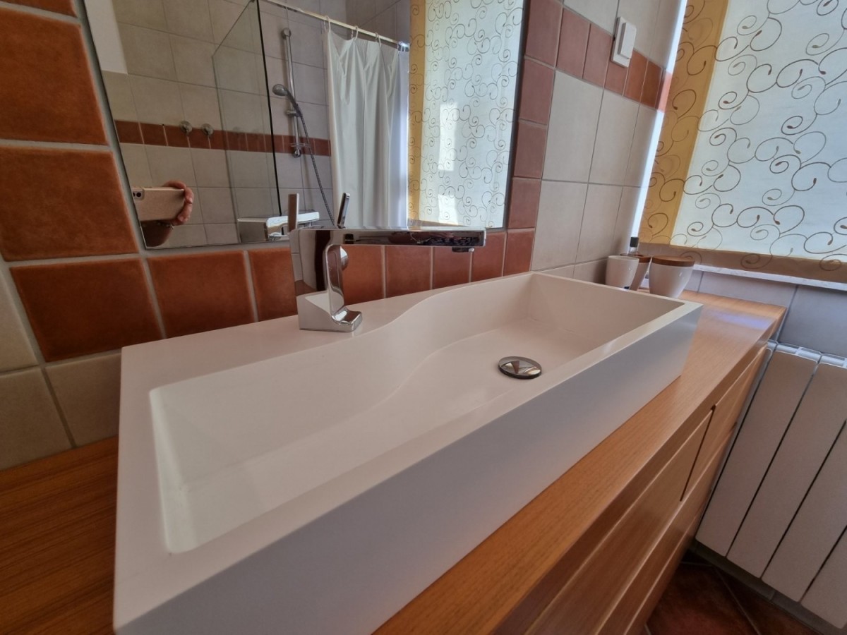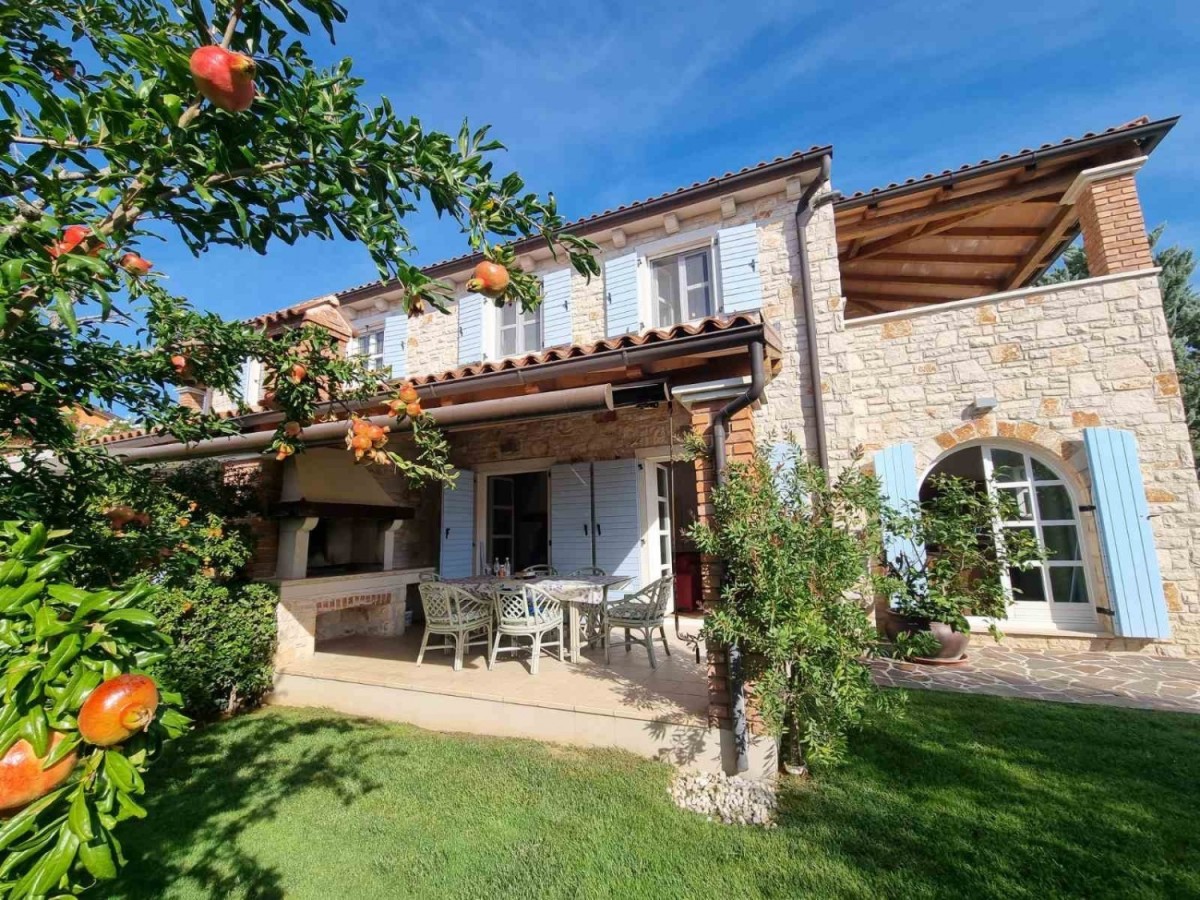 Lepa hiša dvojček se nahaja na mirni lokaciji nedaleč od Poreča in le 1 km od morja. Zgrajena je bila leta 2006, lastniki pa so jo leta 2021 obnovili in jo stalno vzdržujejo. Kupili so jo in jo uporabljali izključno za svoje potrebe, hiša ni bila nikoli v najemu! Skupaj ima 155,55 m2 s terasami (135 m2 zaprtega prostora), na parceli 367 m2. Vrt je velik 200 m2. Hiša je sestavljena iz pritličja in prvega nadstropja, zasnovana je v mediteransko-rustikalnem stilu. V pritličju je hodnik, spalnica, kopalnica, velika dnevna soba s kaminom in kuhinja z jedilnico. Iz dnevne sobe in kuhinje je izhod na pokrito teraso, kjer je še kamin in jedilna miza ter na vrt. V nadstropju sta še dve spalnici, vsaka s svojo kopalnico, ki si delita prostorno pokrito teraso. Terasa je z zunanjim stopniščem povezana z vrtom. Vrt je lepo urejen z mediteranskim rastlinjem, staro oljko, urejeno trato in 30 m2 bazena. Ob bazenu je zgrajena manjša kamnita vrtna hiška 7 m2, kjer je vse predvideno za savno ali pa se lahko uporablja kot shramba. Ob bazenu in hiši je zunanji tuš. Hiša ima 2 parkirni mesti. Celoten vrt je ograjen z zidom, zelenico ali kovinsko ograjo. V zadnjem delu hiše, v bližini bazena, sta shramba/kurilnica in letna kuhinja. Hiša se prodaja s pohištvom po meri za celotno hišo. Ogrevanje je urejeno centralno na kurilno olje. Prenosna klimatska naprava je nameščena samo v eni spalnici. Namestili so tudi alarm in video kamero. Hiša je vseljiva takoj!