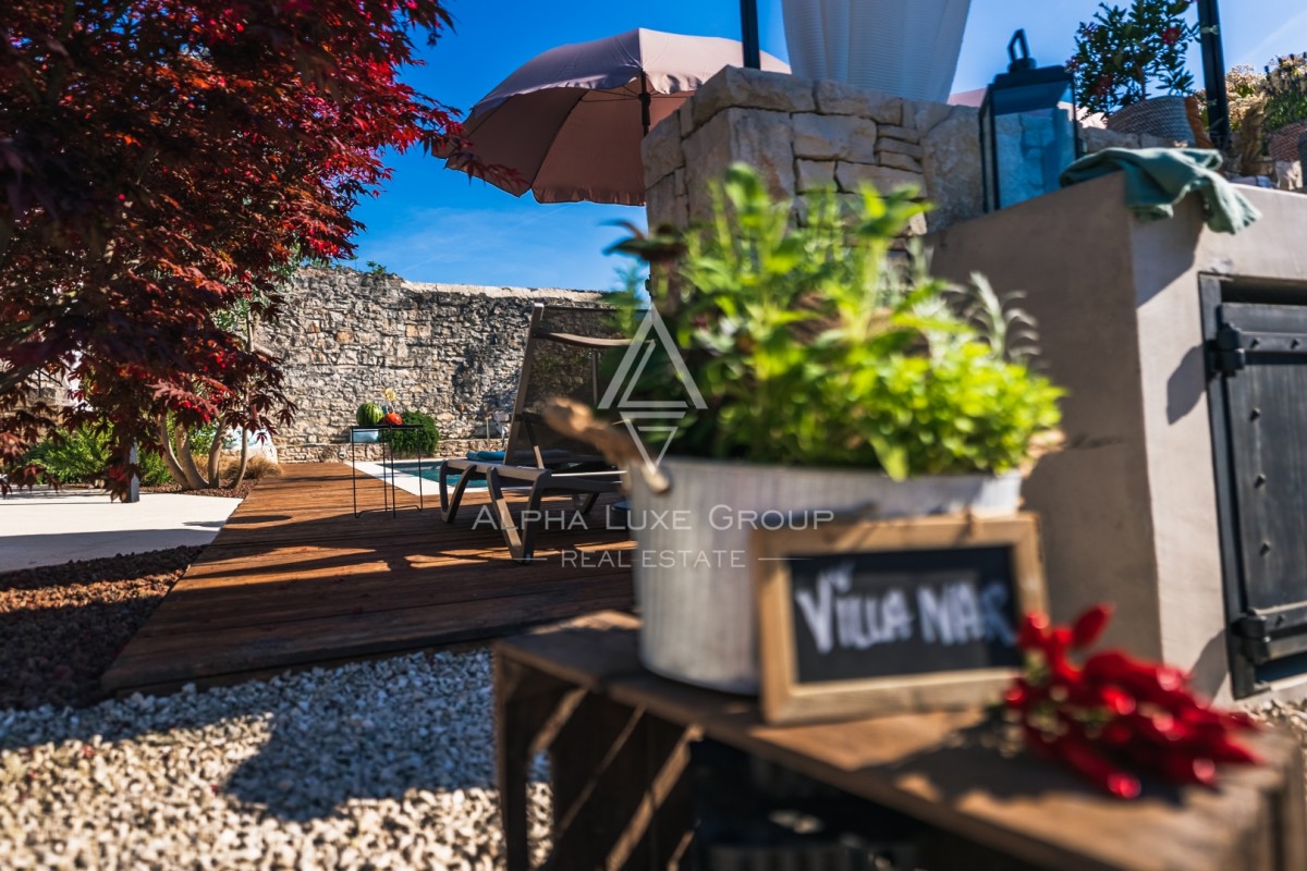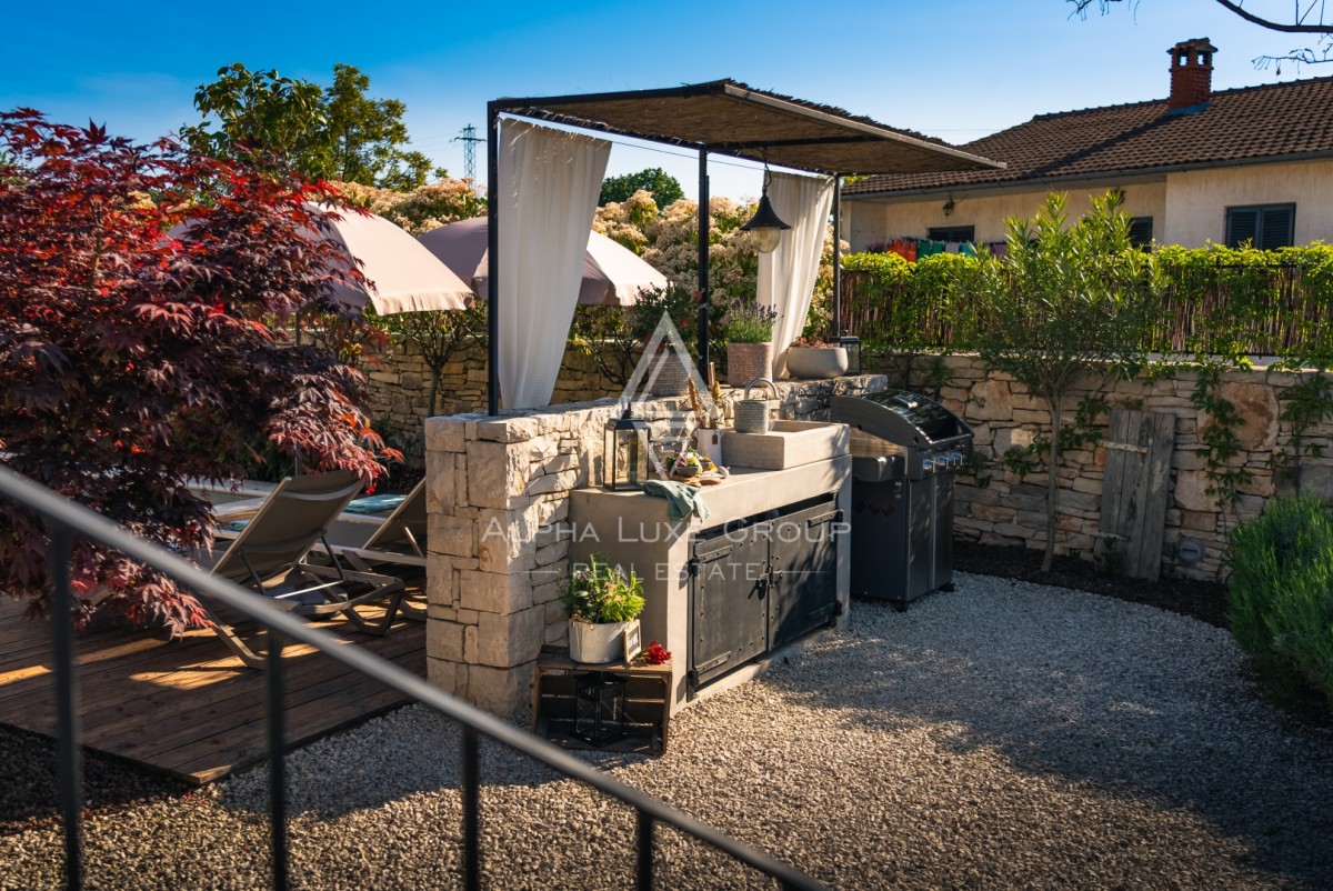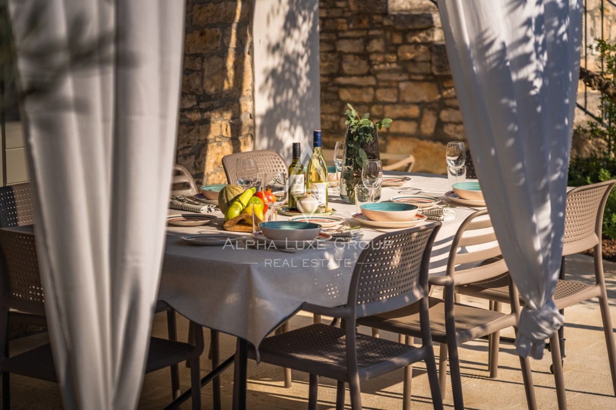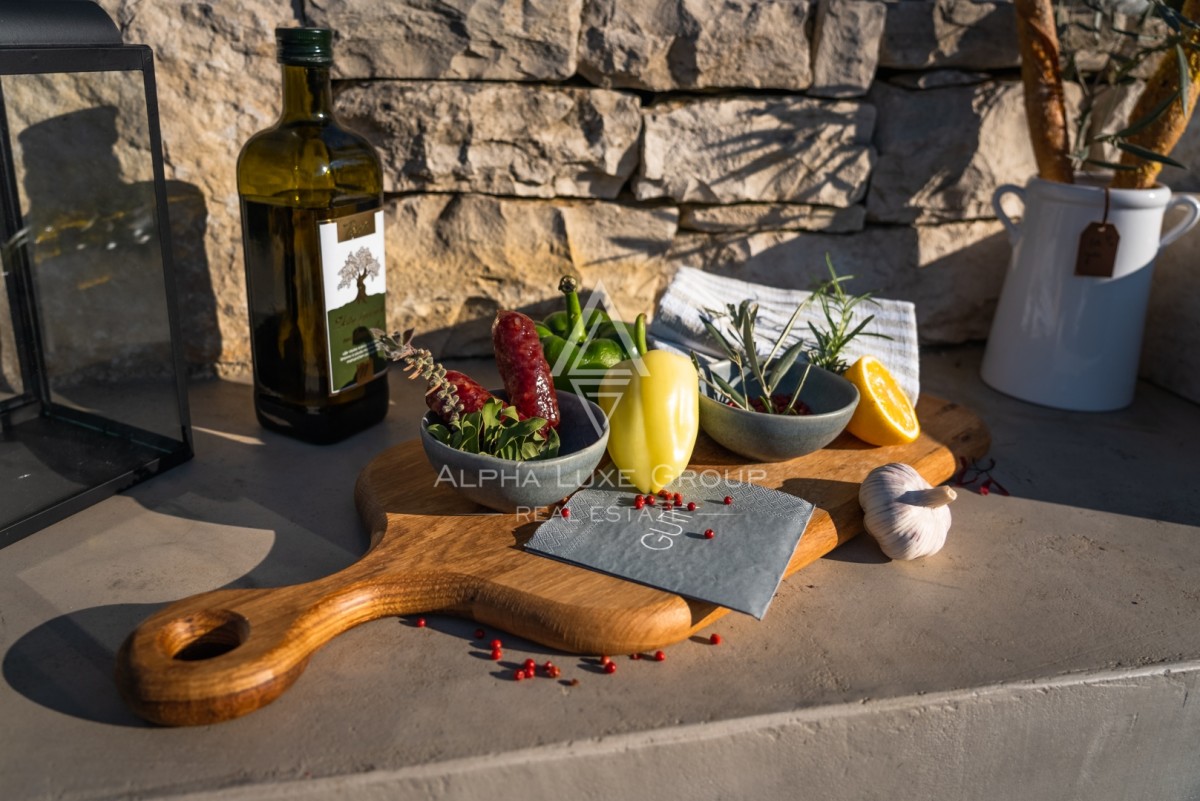 Na prostem boste našli zasebni ogrevan bazen s slano vodo velikosti 23 m², opremljen z ležalniki, senčniki in zunanjo prho. Pokrita terasa z žarom, zunanjo kuhinjo in kamnitim kotičkom za druženje vabi k obrokom na prostem. Ograjen vrt z bujnim mediteranskim rastlinjem zagotavlja zasebnost in varnost za družino.