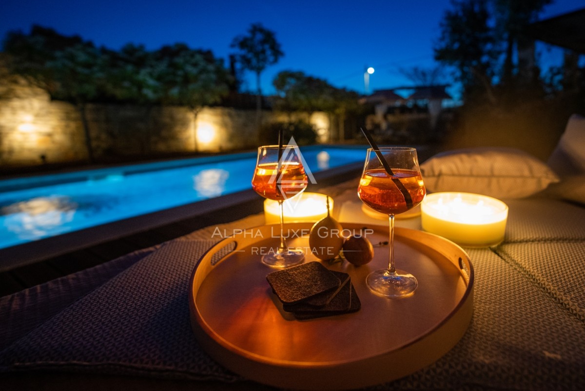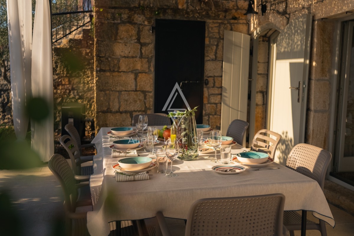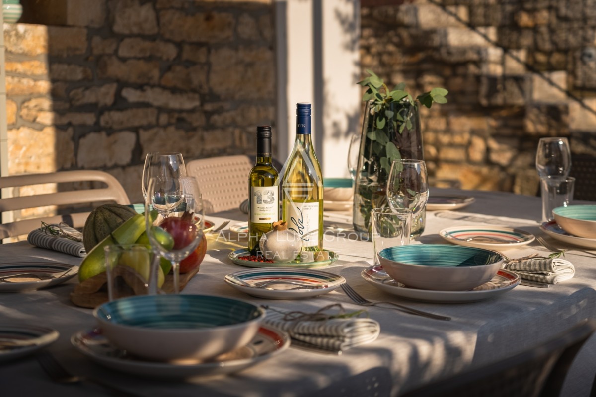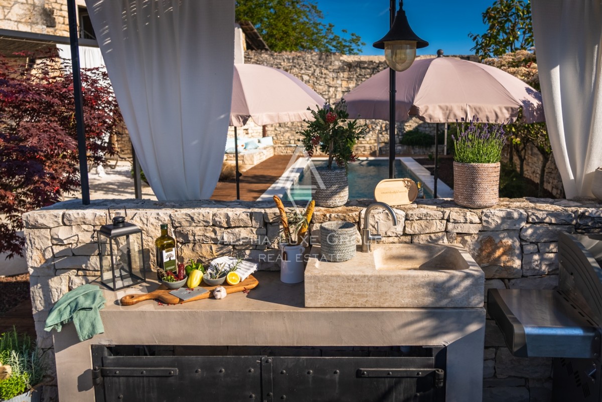 Na prostem boste našli zasebni ogrevan bazen s slano vodo velikosti 23 m², opremljen z ležalniki, senčniki in zunanjo prho. Pokrita terasa z žarom, zunanjo kuhinjo in kamnitim kotičkom za druženje vabi k obrokom na prostem. Ograjen vrt z bujnim mediteranskim rastlinjem zagotavlja zasebnost in varnost za družino.