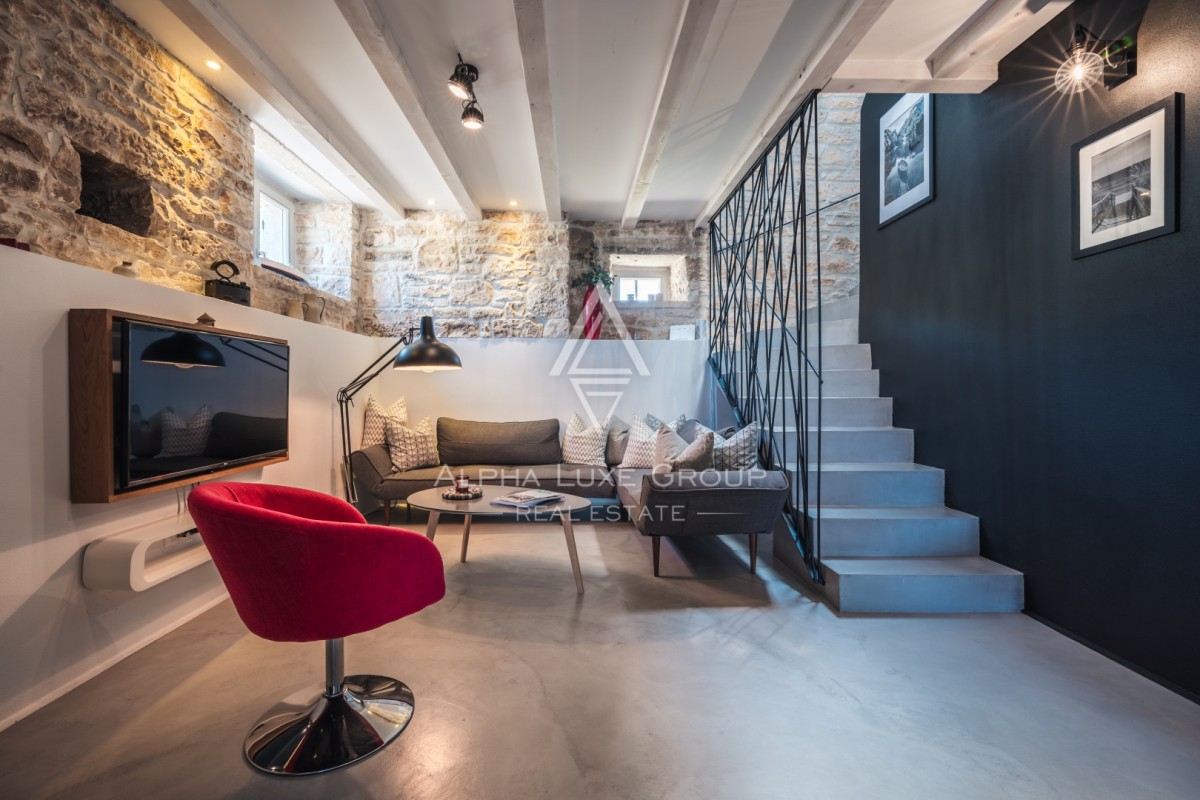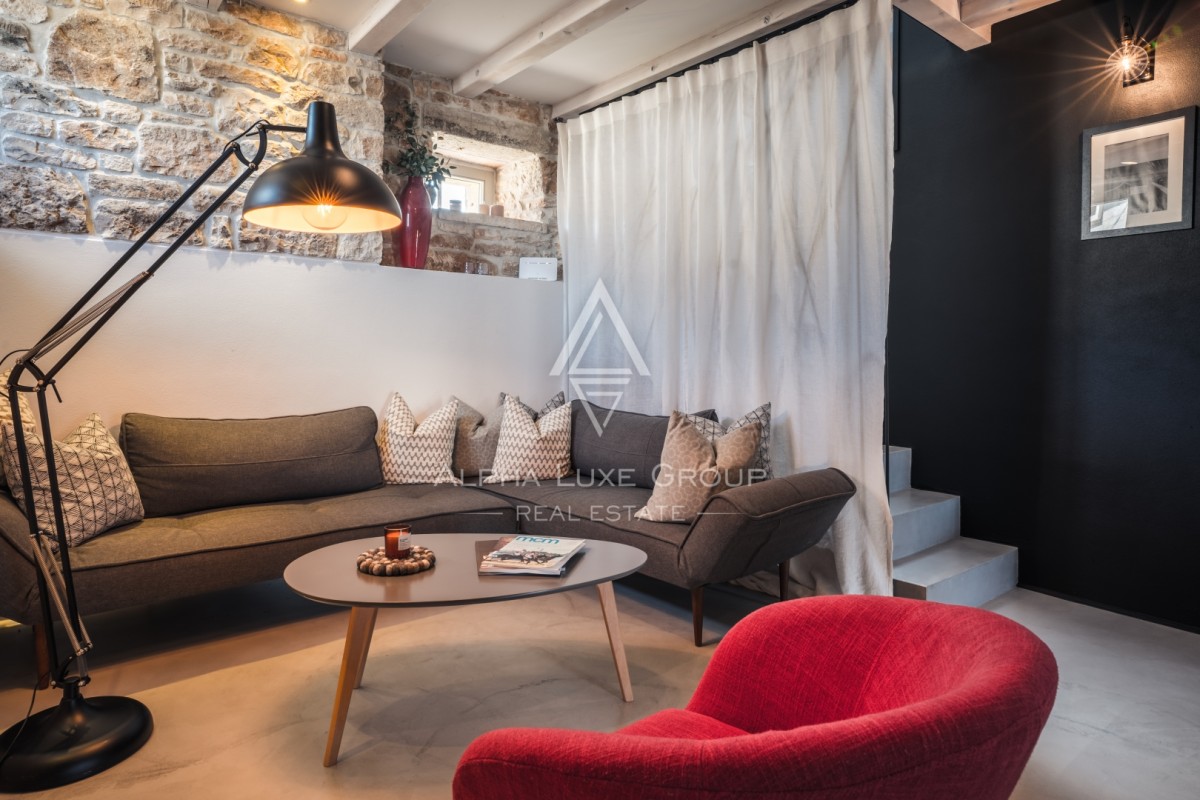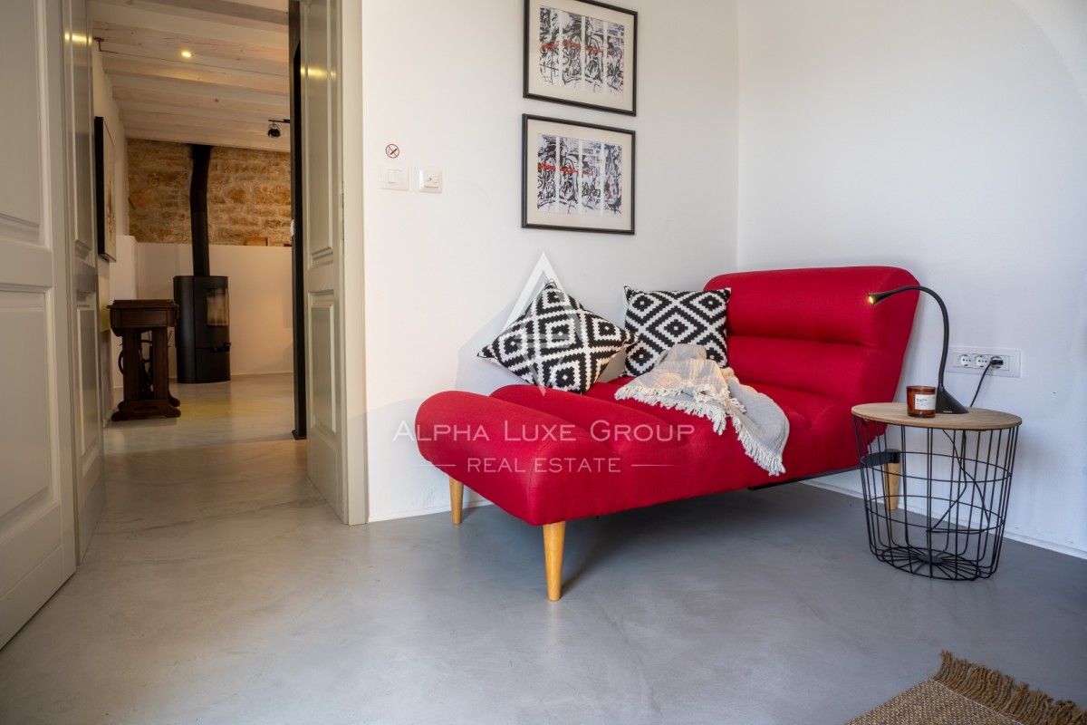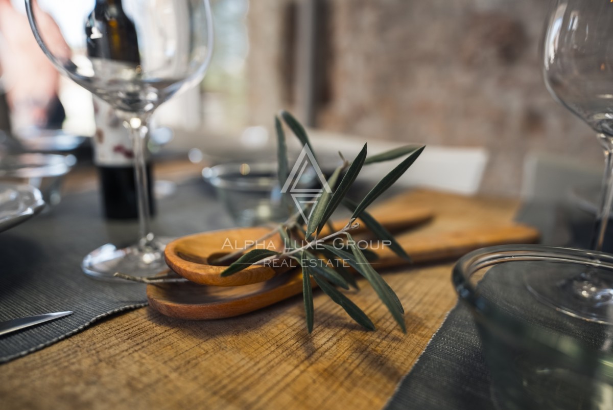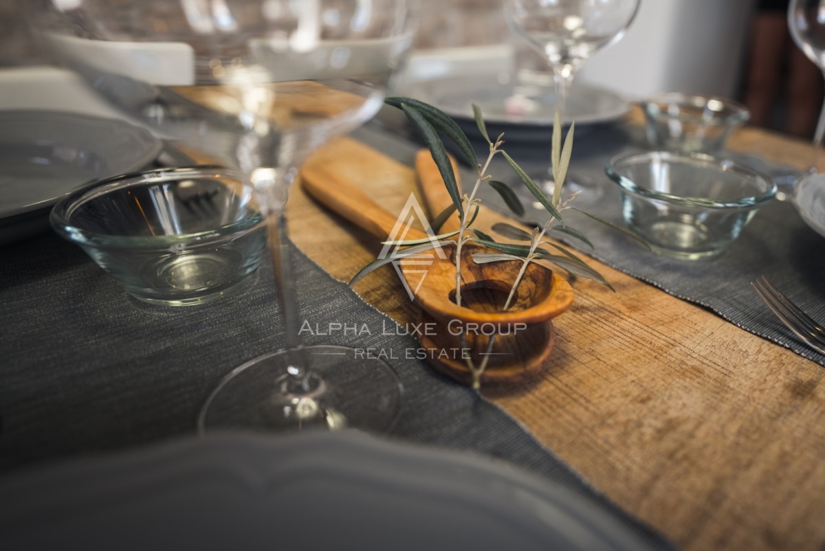 Odprta kuhinja z jedilnico nudi pogled na mediteranski vrt, dnevna soba s tradicionalnim kaminom pa ustvarja prijetno vzdušje, popolno za sproščanje. Ena od spalnic se nahaja v pritličju in je primerna za osebe z zmanjšano mobilnostjo. Notranjost vključuje tudi talno gretje, klimatsko napravo, delovni kotiček in pametni televizor.
