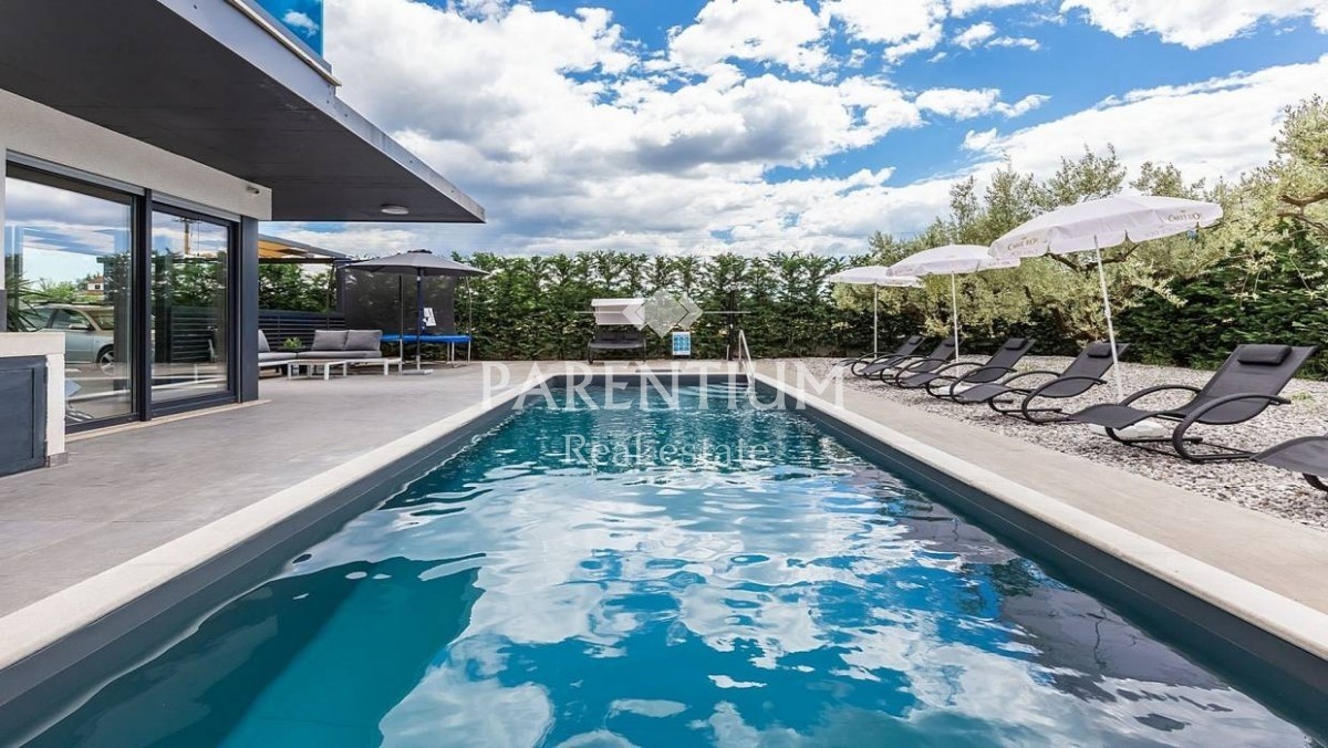 PRITLIČJE: odprt in osvetljen prostor, kjer se nahaja kuhinja z jedilnico, dnevna soba z izhodom na teraso, dvorišče z bazenom, hodnik, kopalnica, dve spalnici z lastno kopalnico in garderoba.