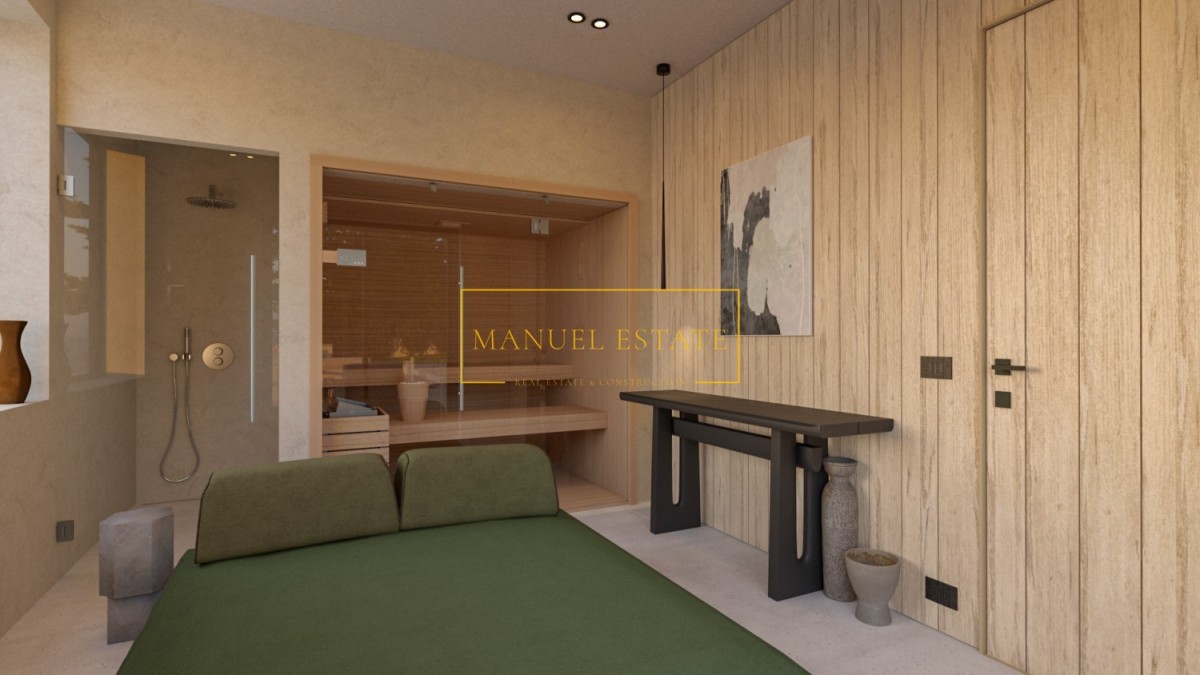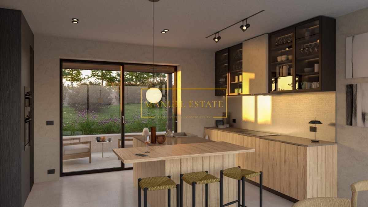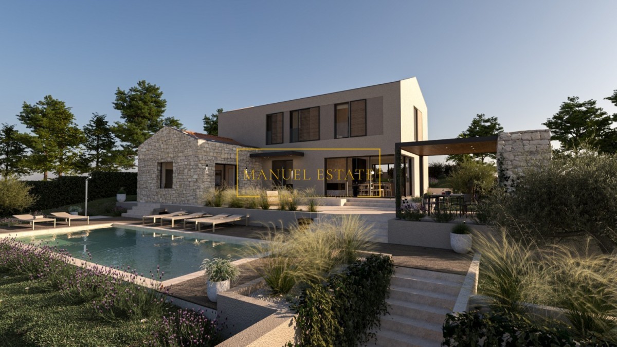 Impresivna vila na mirni in lepi lokaciji, ki se nahaja približno 10 km od morja in Vrsarja ter približno 15 km od Poreča. Moderna vila 180 m2 na zemljišču 938 m2. Vila je v zaključni fazi gradnje. Razprostira se v dveh etažah, pritličje obsega: dnevno sobo odprtega tipa, kuhinjo z jedilnico, steklenimi stenami in izhodom na teraso, nato WC, garderobo, pralnico, shrambo. , tehnični prostor za centralno ogrevanje ter wellness s savno in tušem. V prvem nadstropju so tri spalnice, vsaka s svojo kopalnico. Skrbno urejen vrt z namakalnim sistemom, bazen (40 m2) z ogrevanjem, prostor za sončenje, zunanji tuš, kamin s pokritim prostorom za sprostitev in letno kuhinjo. V ograjenem dvorišču sta tudi dve parkirni mesti s polnilnico za električna vozila.