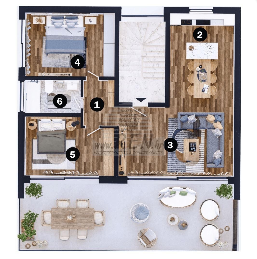 Stanovanje ima skupno 82,25 m2, terase dodatno ima 43,80 m2, oddaljeno je 5 min. (100m) od morja in od čudovite urejene naravne plaže, 10 min. (6000m) oddaljena od centra Umaga. Apartma se nahaja v prvom nadstropju. V razvoju. Skupaj je 2 spalnice, kuhinja, dnevna soba, 1 kopalnica, shramba. Stanovanje ima 2 lastna parkirišča, teraso, kamin, klimo, luksuzno opremljeno. V zasebnem naselju z recepcijo, možnostjo skupne uporabe telovadnice, wellnessa, otroškega igrišča, Wine bara, 24-urnim nadzorom, polnilno postajo za električne avtomobile, na voljo paketi vzdrževanja objekta.