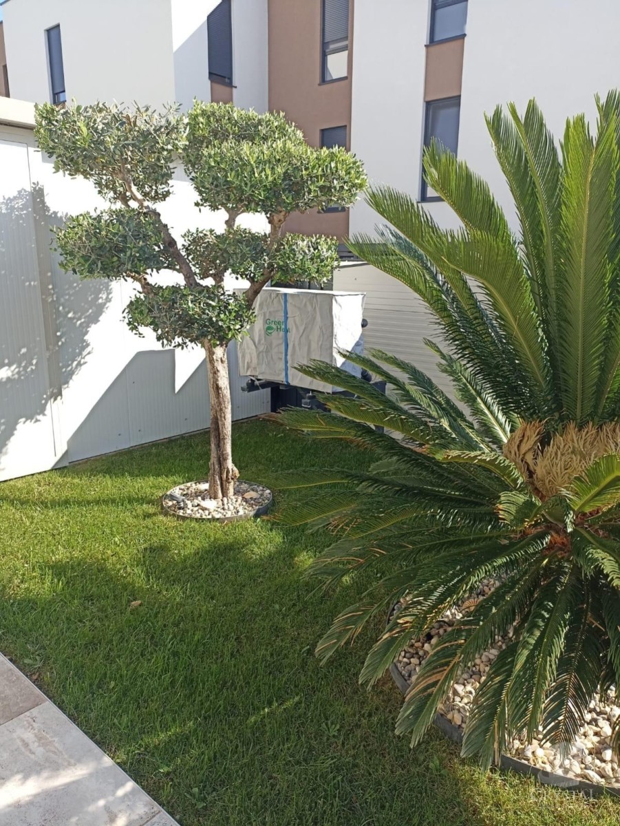 Vrt je skrbno zasnovan in opremljen z ogrevanim bazenom s slano vodo (sistem elektrolize), sončnim tušem ter zaprtim prostorom velikosti 24 m², kjer se nahaja strojnica bazena in dodatna shramba. Avtomatski namakalni sistem in popolna ograjenost vrta zagotavljata visoko stopnjo zasebnosti.