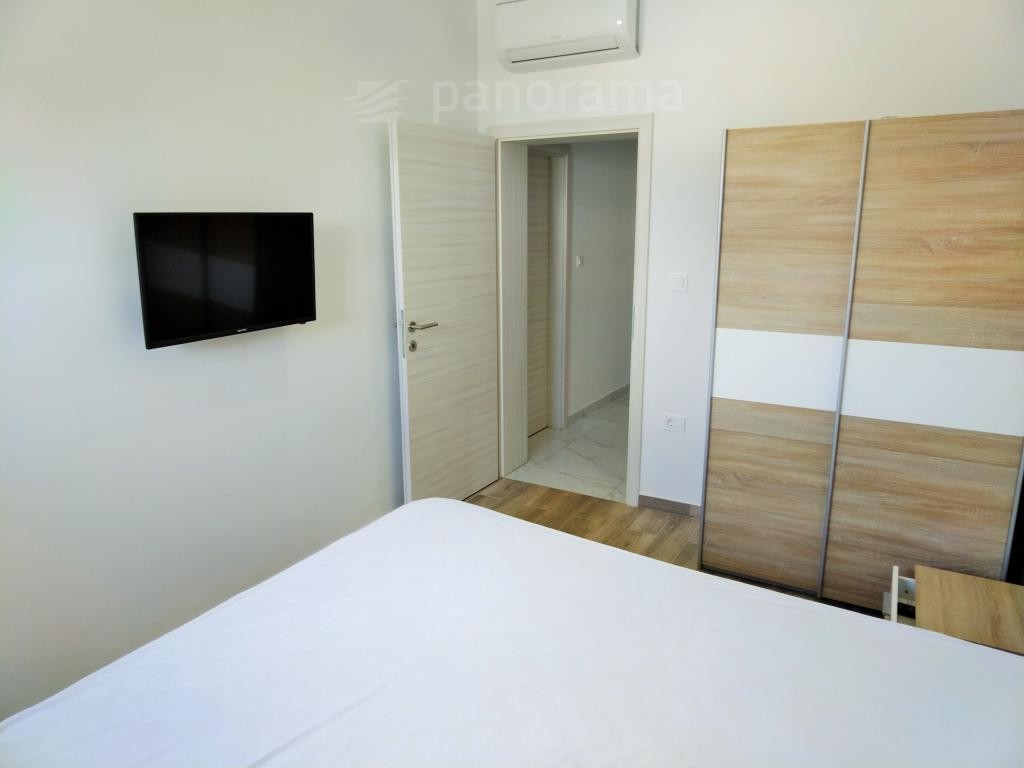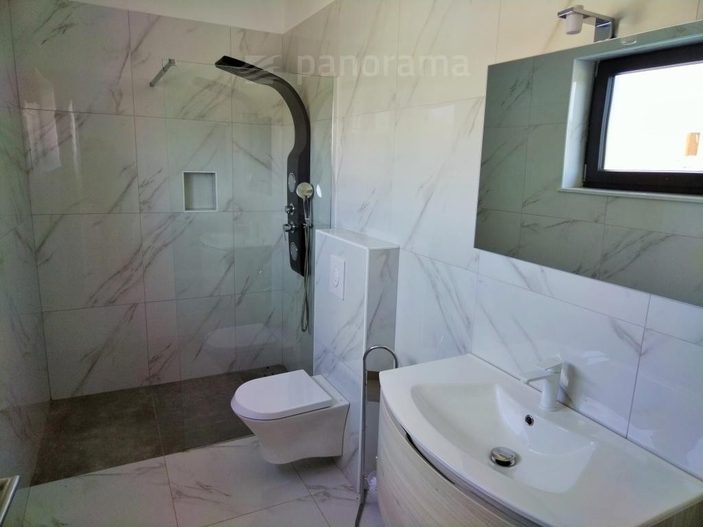 Hiša ima površino 120 m2 in je sestavljena iz kuhinje z odprto jedilnico in dnevno sobo, 3 spalnic, vsaka s svojo kopalnico, shrambe in stranišča za goste. Iz dnevne sobe je skozi velike steklene stene dostop do prostora za sončenje in bazena. Hiša je v celoti opremljena in pohištvo je vključeno v ceno.