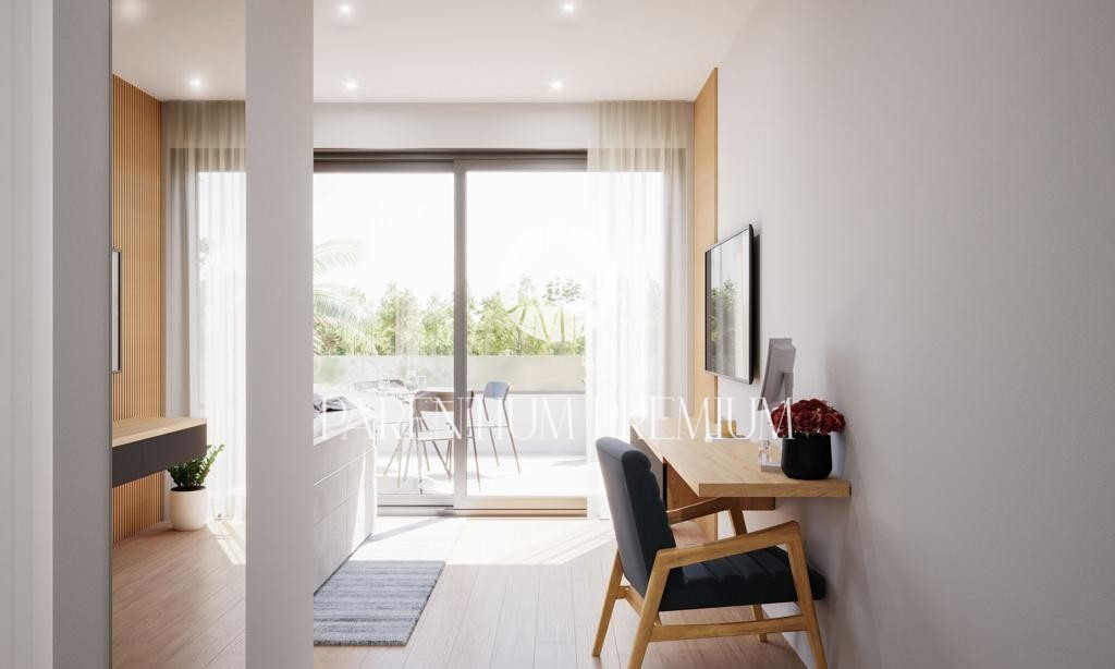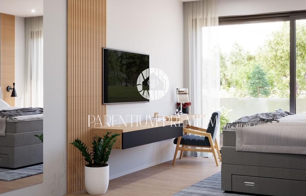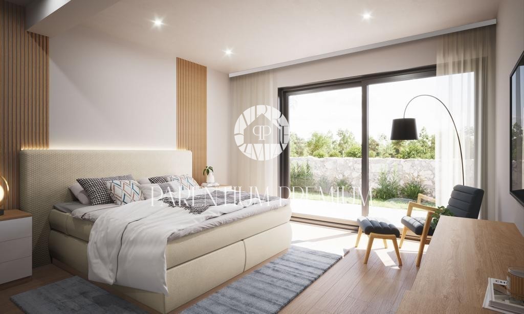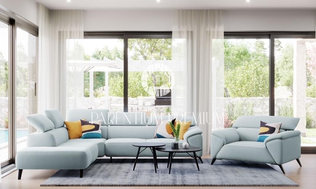 Notranjost vile predstavlja udobje, ki ga je čutiti že v pritličju, kjer se nahaja dnevna soba s kuhinjo in jedilnico v velikosti do 63m2, izjemno dobro osvetljena skozi velike odprtine, ki so povezane z izhodom v terasa in sončna ploščad okoli bazena. V tem nadstropju imamo eno spalnico z lastno kopalnico, iz katere lahko preko velike drsne stene dostopate tudi do bazena.
