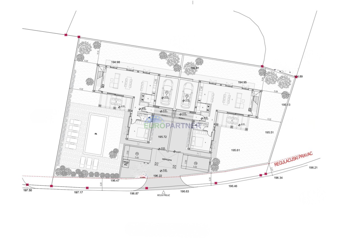 Vsaka od teh dveh hiš pokriva površino 175 m2, ki se razprostira v dveh etažah. V pritličju se nahaja garaža in bivalni del, ki obsega predsobo, prostorno dnevno sobo z jedilnico in kuhinjo ter izhodom na veliko teraso, shrambo, spalnico in kopalnico. V prvem nadstropju sta še dve spalnici, vsaka s svojo kopalnico, ter velika terasa z jacuzzijem, ki ponuja čudovit razgled na okolico.