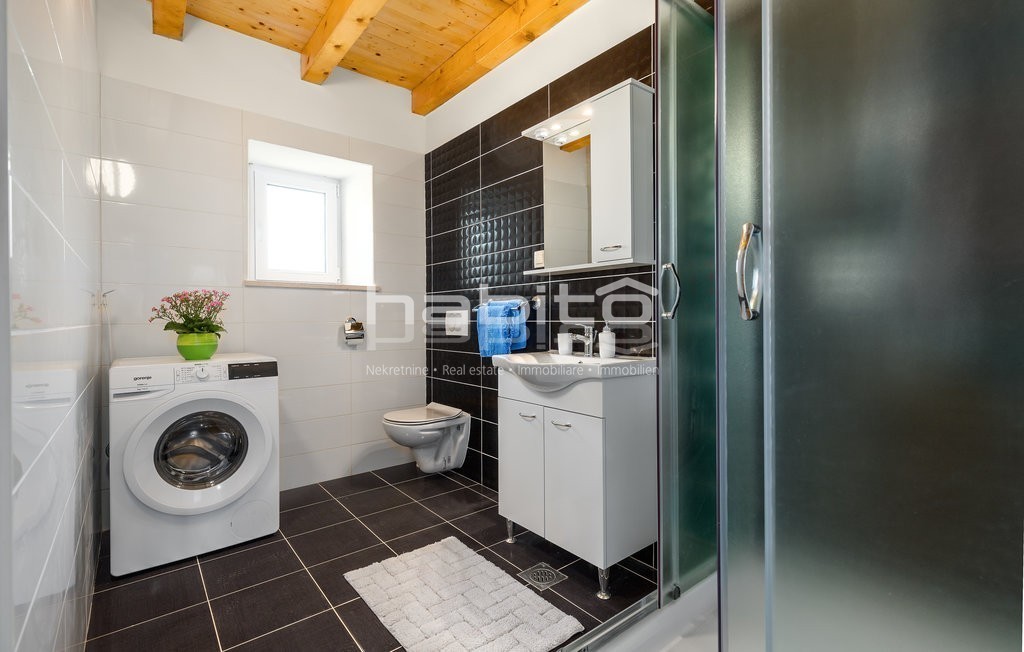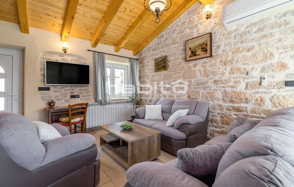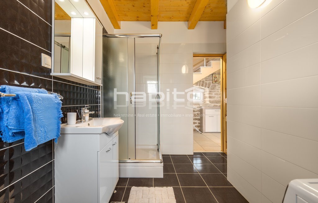 Kamnita hiša površine cca. 150 m2 z bazenom je zasnovana v modernem stilu, hkrati pa ohranja pridih izvorne istrske tradicije. V pritličju je dnevna soba, kuhinja, jedilnica, shramba in spalnica z lastno kopalnico.