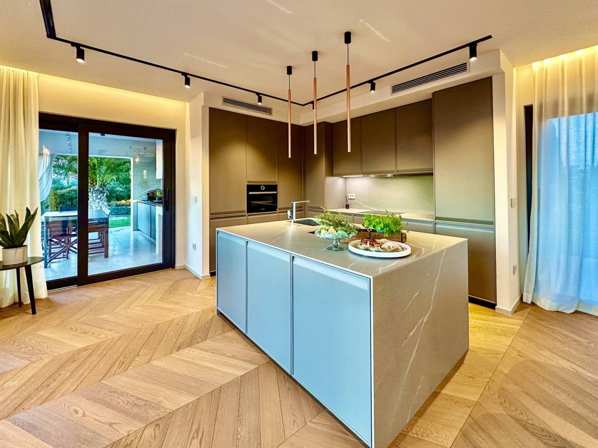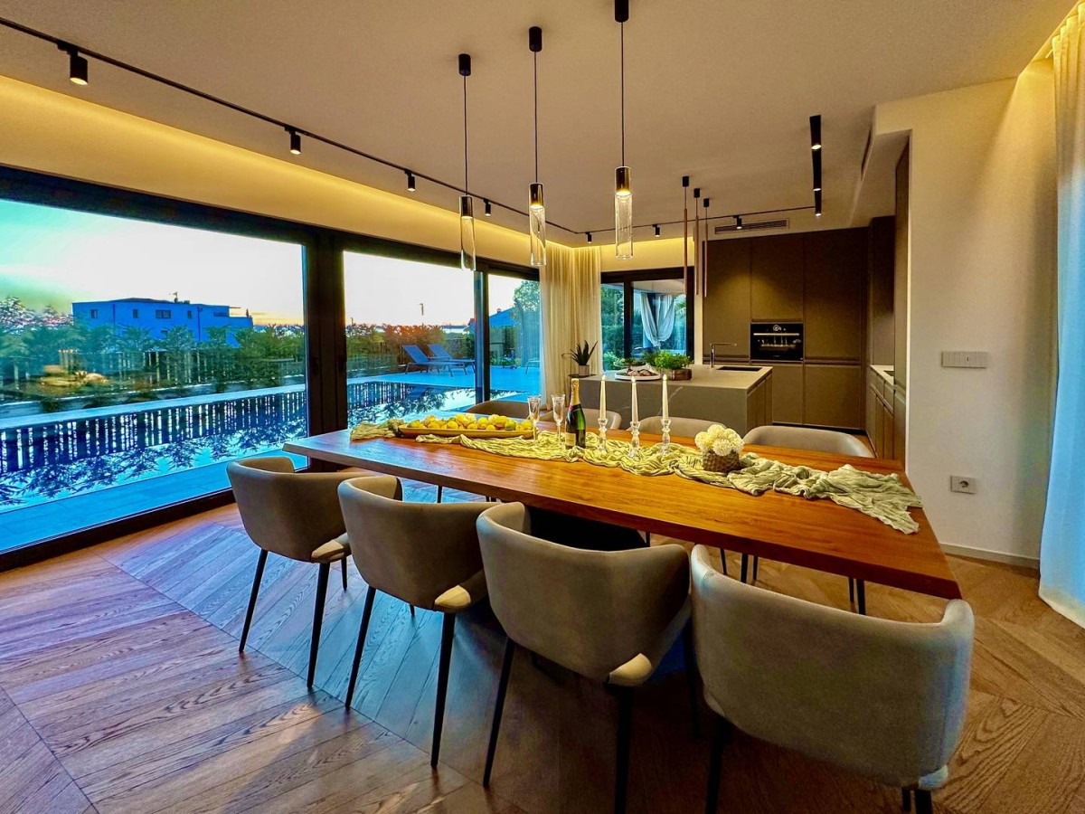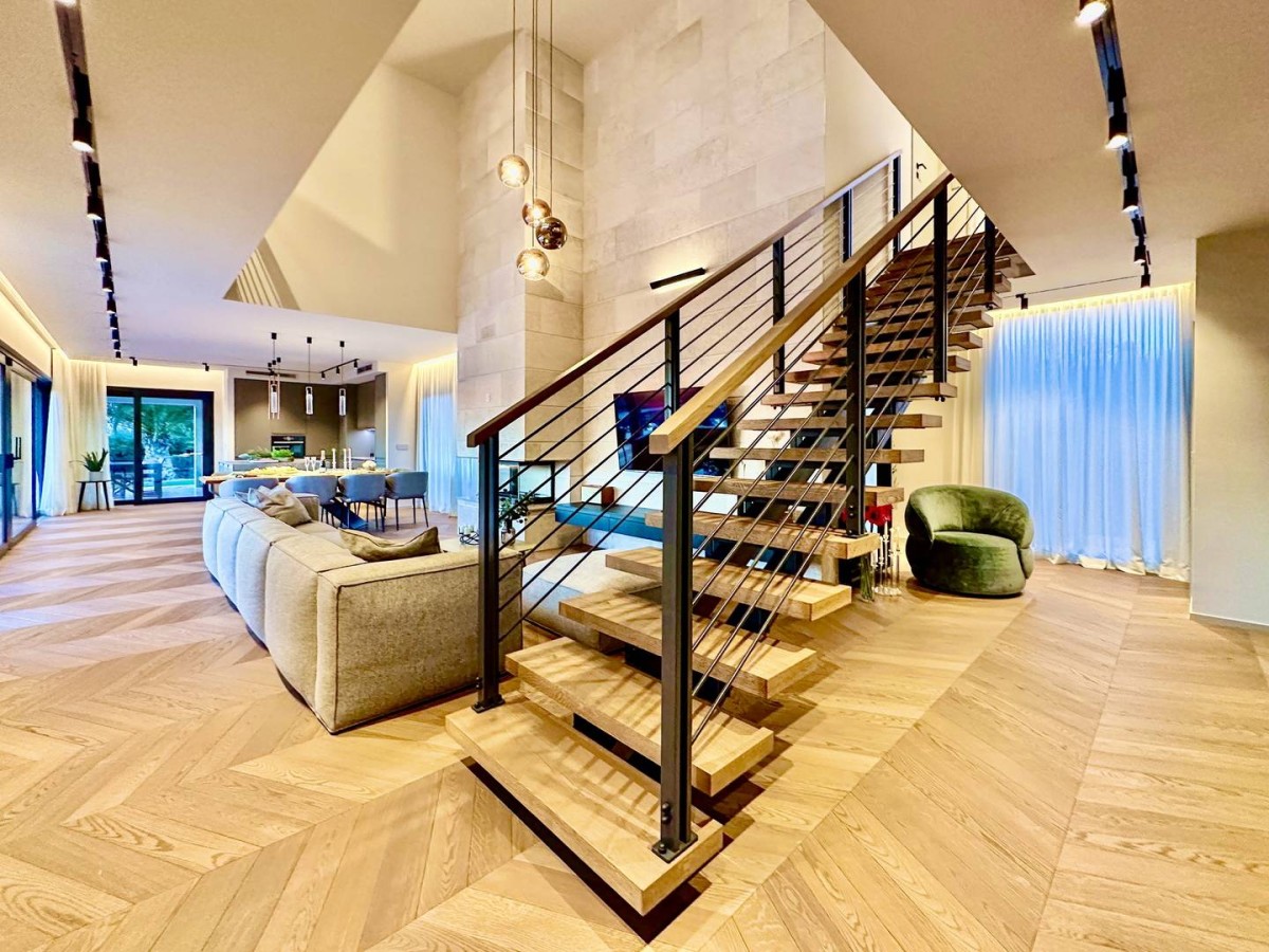 Notranjost vile izžareva prefinjenost in udobje – popolnoma je opremljena z oblikovalskim pohištvom priznanih italijanskih blagovnih znamk, skrbno izbranih za dosego harmonije estetike in funkcionalnosti.