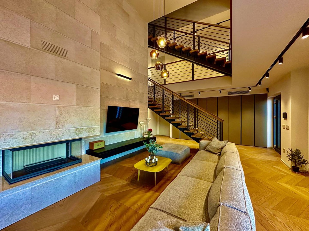 Celoten zid v dnevnem prostoru, ki sega do stropa drugega nadstropja, je obložen z naravnim kamnom in prostoru daje monumentalnost ter toplino.