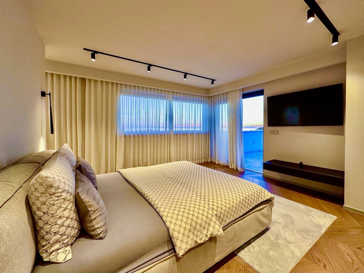 Ekskluzivni glavni apartma velik 120 m2, ki zavzema celo nadstropje. Sestavljen je iz elegantnega spalnega dela, garderobe, zasebne pisarne, luksuzne kopalnice in dveh velikih teras s panoramskim pogledom na morje. Na terasi z razgledom na morje je možnost vgradnje hidromasažne kadi.