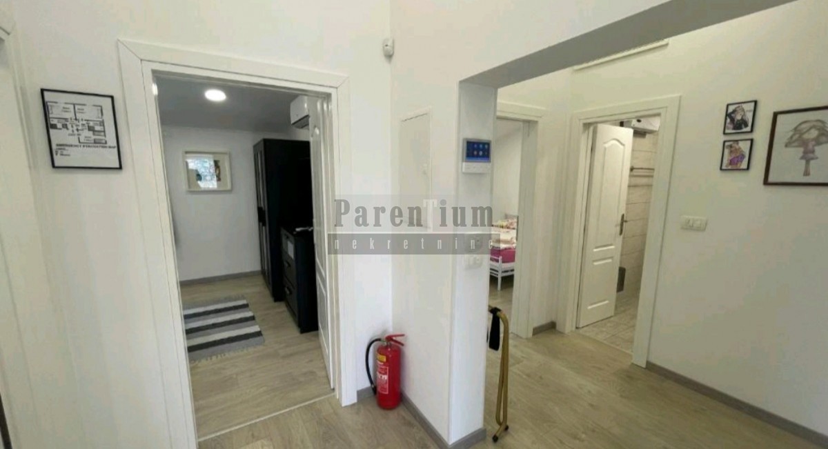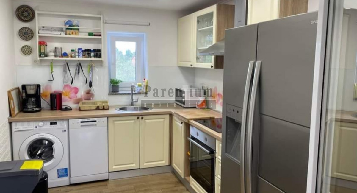 V pritličju hiše se nahaja prostorna dnevna soba, jedilnica, kuhinja, ena spalnica in kopalnica. Zunanje stopnišče vodi v prvo nadstropje, kjer so še tri spalnice in dve kopalnici, velika pokrita terasa. Vsaka soba v hiši ima klimatsko napravo, TV sobe. V hišo je možno vgraditi peč na drva ali pelete.