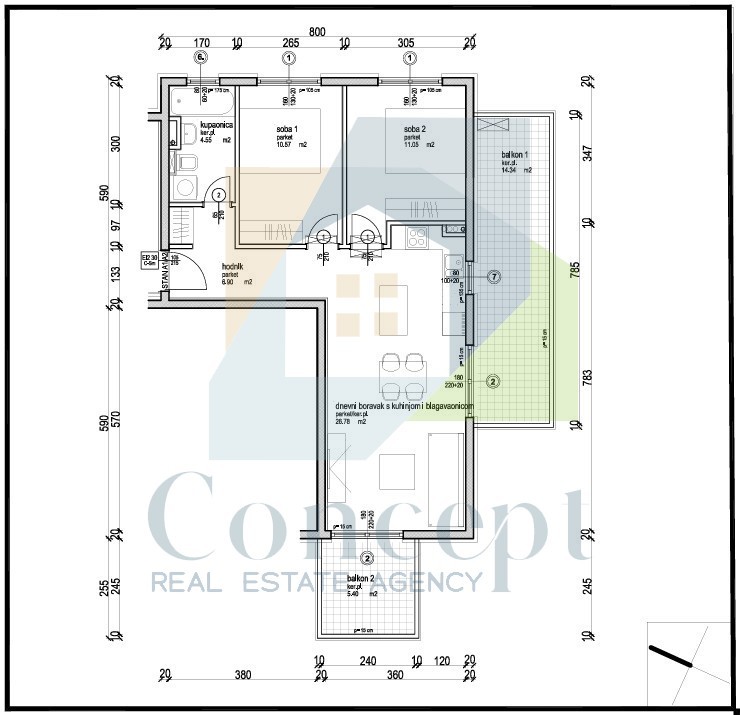 Stan ima površino 69,72 m² in obsega vhodni hodnik, kopalnico, dve prostorni spalnici ter kuhinjo z dnevno sobo in jedilnico, iz katerih je izhod na en manjši in en večji balkon s pogledom na morje.