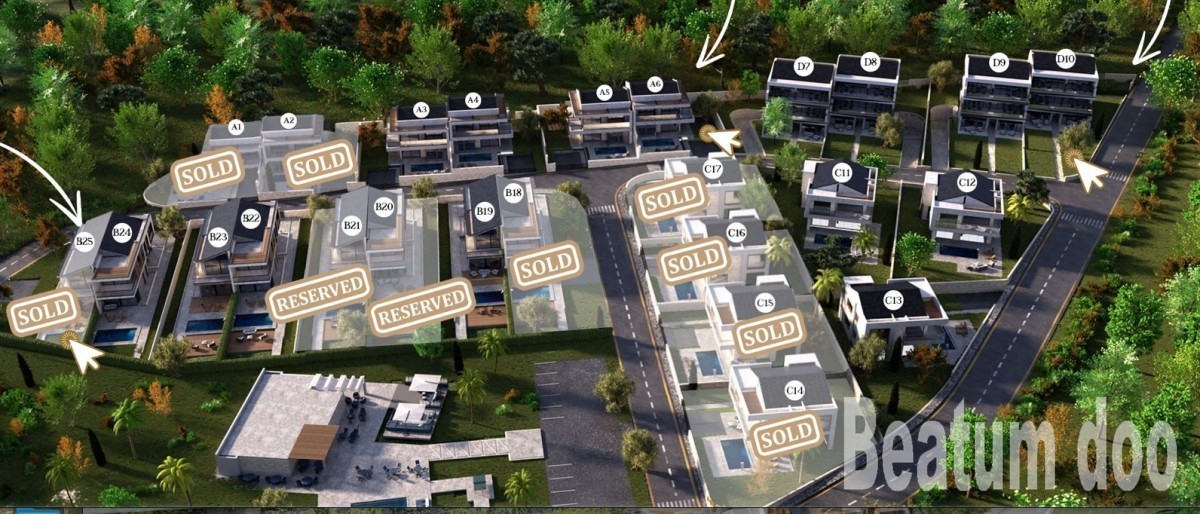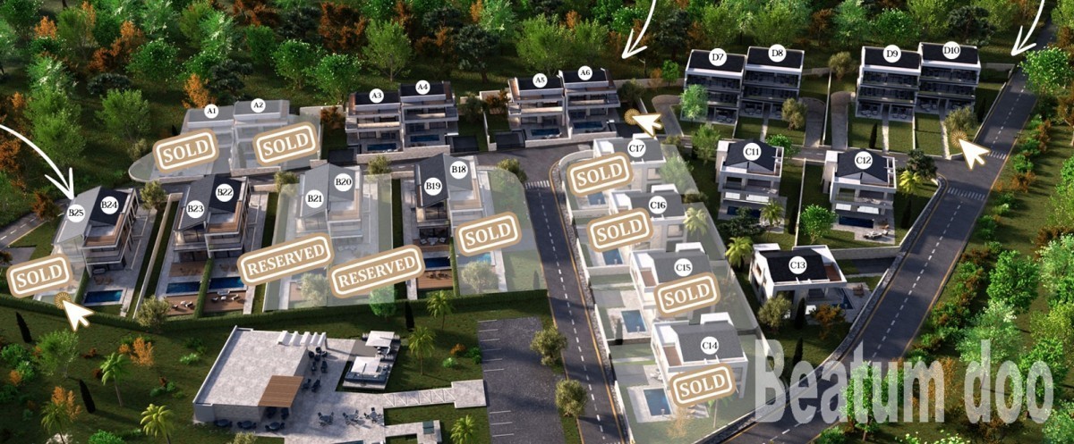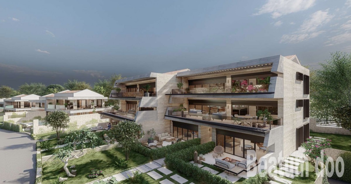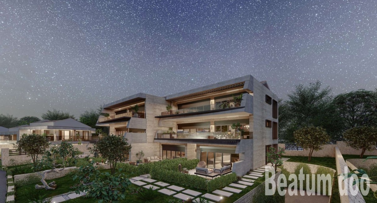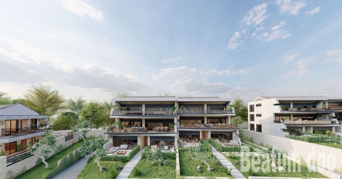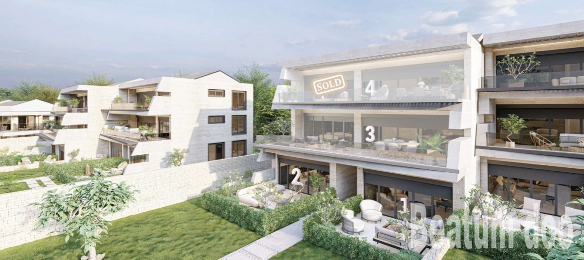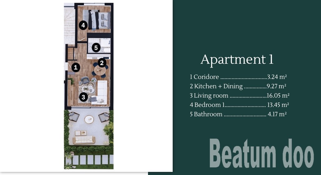 Apartma 1 v pritličju, ena spalnica, ena kopalnica, kuhinja + jedilnica, dnevna soba, terasa, parkirno mesto