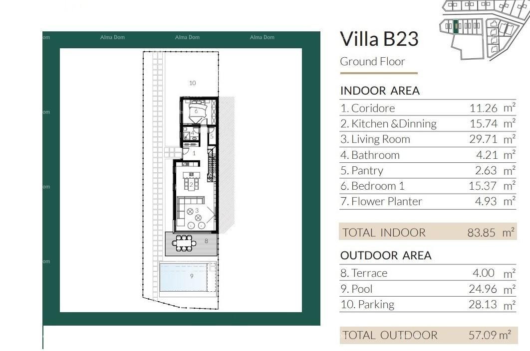 Vila B23, skupne površine 211,95 m2, je sestavljena iz pritličja in prvega nadstropja. V pritličju je hodnik, dnevna soba, kuhinja z jedilnico, kopalnica, spalnica, shramba in zelenica za rože.