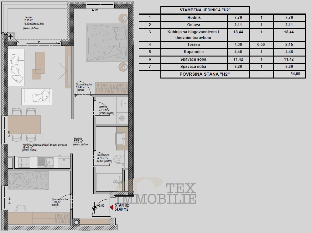 Stanovanje je lepo razporejeno in obsega dnevno sobo s kuhinjo in jedilnico (18,44 m²), dve spalnici, shrambo, kopalnico ter teraso.