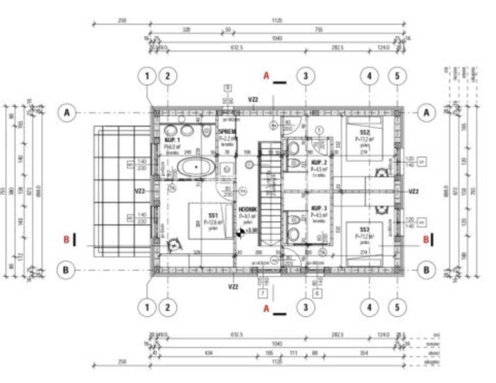 V prvo nadstropje vodijo notranje stopnice, v prvem nadstropju pa so 3 spalnice, vsaka s svojo kopalnico.