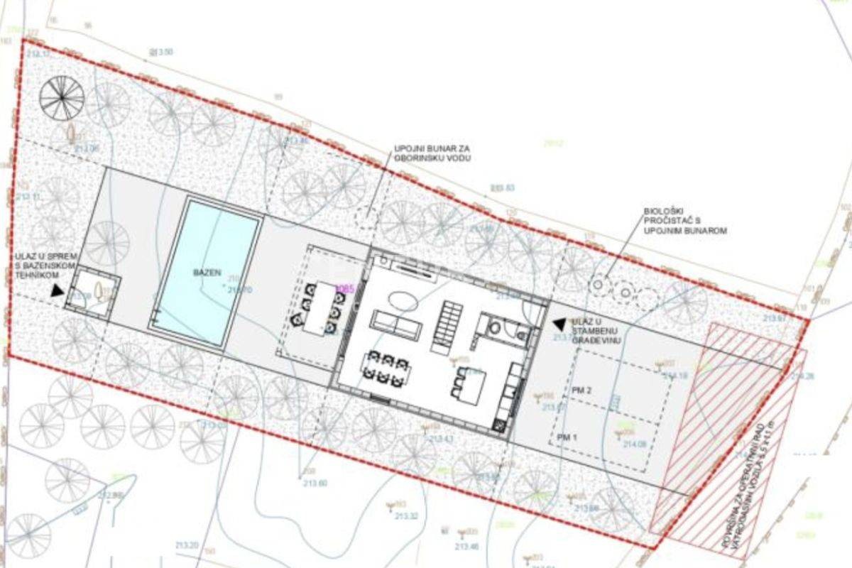 Na omenjenem zemljišču je predvidena gradnja samostojnega stanovanjskega objekta, pritličje in nadstropje, 120m2 neto, pomožni objekti - zunanji bazen, shramba z bazensko opremo, biološka čistilnica, 2 parkirni mesti.