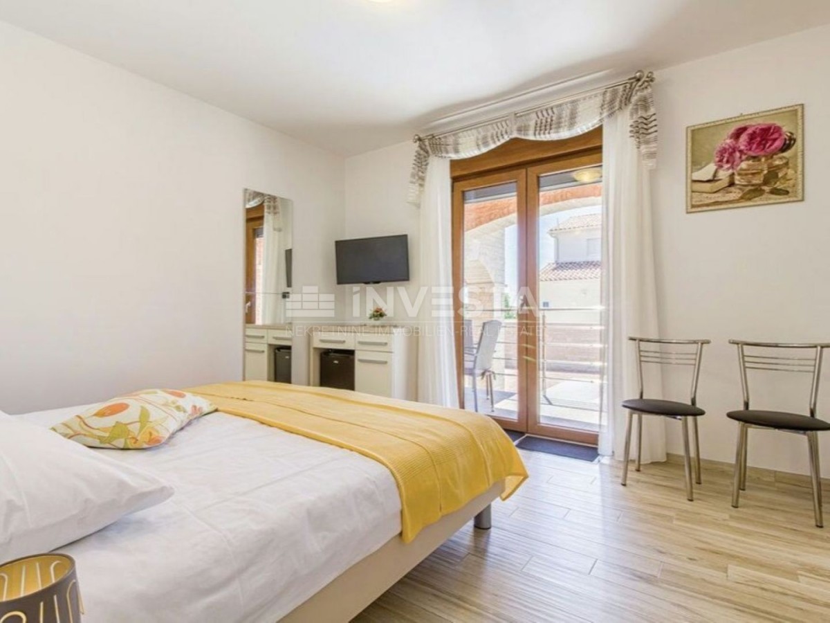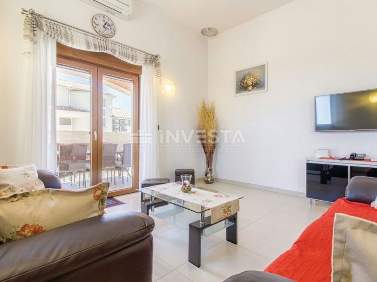 Pritličje je zelo praktično organizirano – dve udobni spalnici, vsaka s svojo kopalnico, sta ločeni od dnevnega dela hiše. Osrednji prostor je prostorna dnevna soba, ki je povezana s kuhinjo z jedilnico, popolnoma opremljeno za vsakodnevno uporabo. V pritličju so tudi gostinski WC, shramba in tehnična soba z bojlerjem prostornine 300 litrov, ki uporablja energijo sončnih panelov. Iz dnevne sobe in ene spalnice je izhod na pokrito teraso, s katere je pogled na urejen vrt in bazen.