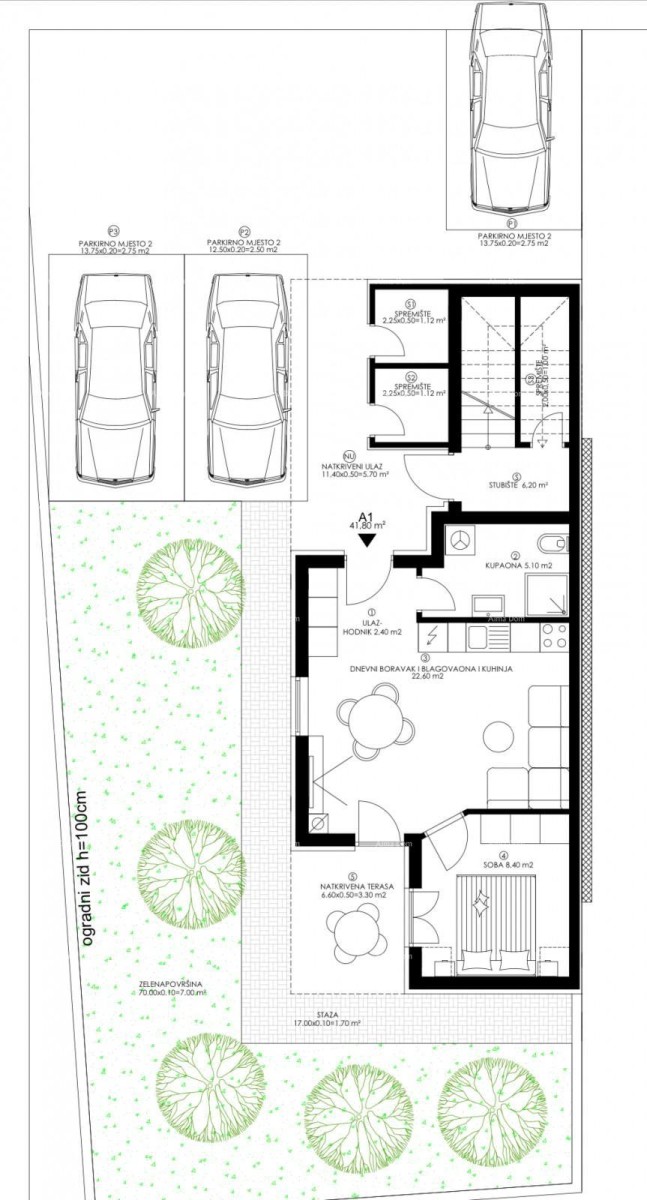 Nov stambeni projekt v mirnem delu Pule. Zgradba s tremi etažami in skupno tremi stanovanji – po eno na vsaki etaži.