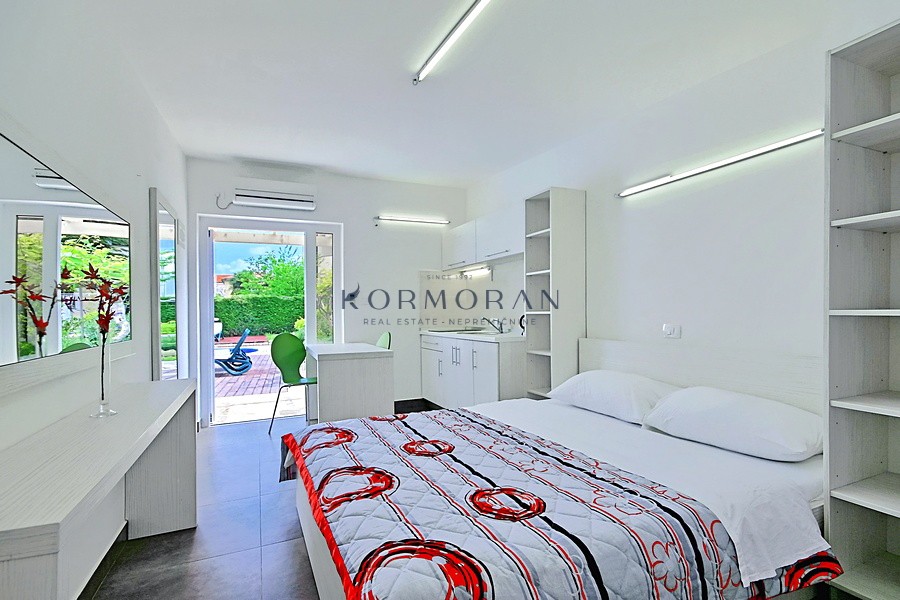 Samostojna hiša v Umagu z 12 apartmaji. Vsak apartma je opremljen s pohištvom in centralnim ogrevanjem. Hiša se nahaja na mirni lokaciji, obdana z zelenjem. V Hiša ima bazen 32 m2 in vanjski jacuzzi. V bližini hiše se nahaja: 300 m teniških igrišč, 500 m plaže, 800 m trgovin, 800 m restavracij, 2000 m središča. Naložba z veliko donosnostjo kapitala.