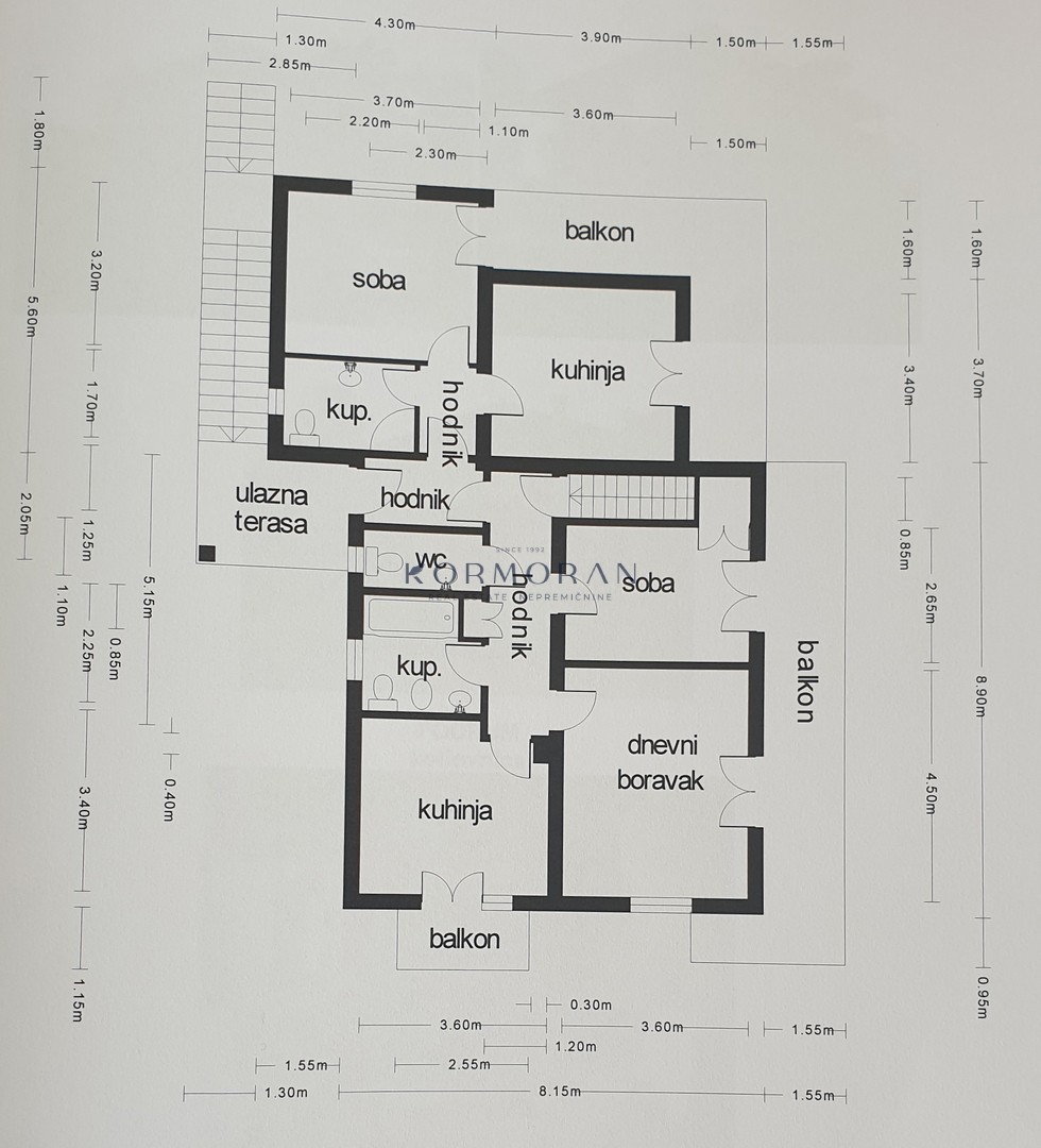 Hiša je sestavljena iz: 3 apartmajev. Dva apartmaja se nahajata v prvem nadstropju in eno v pritličju. V sklopu hiše se nahaja garaža in shramba.