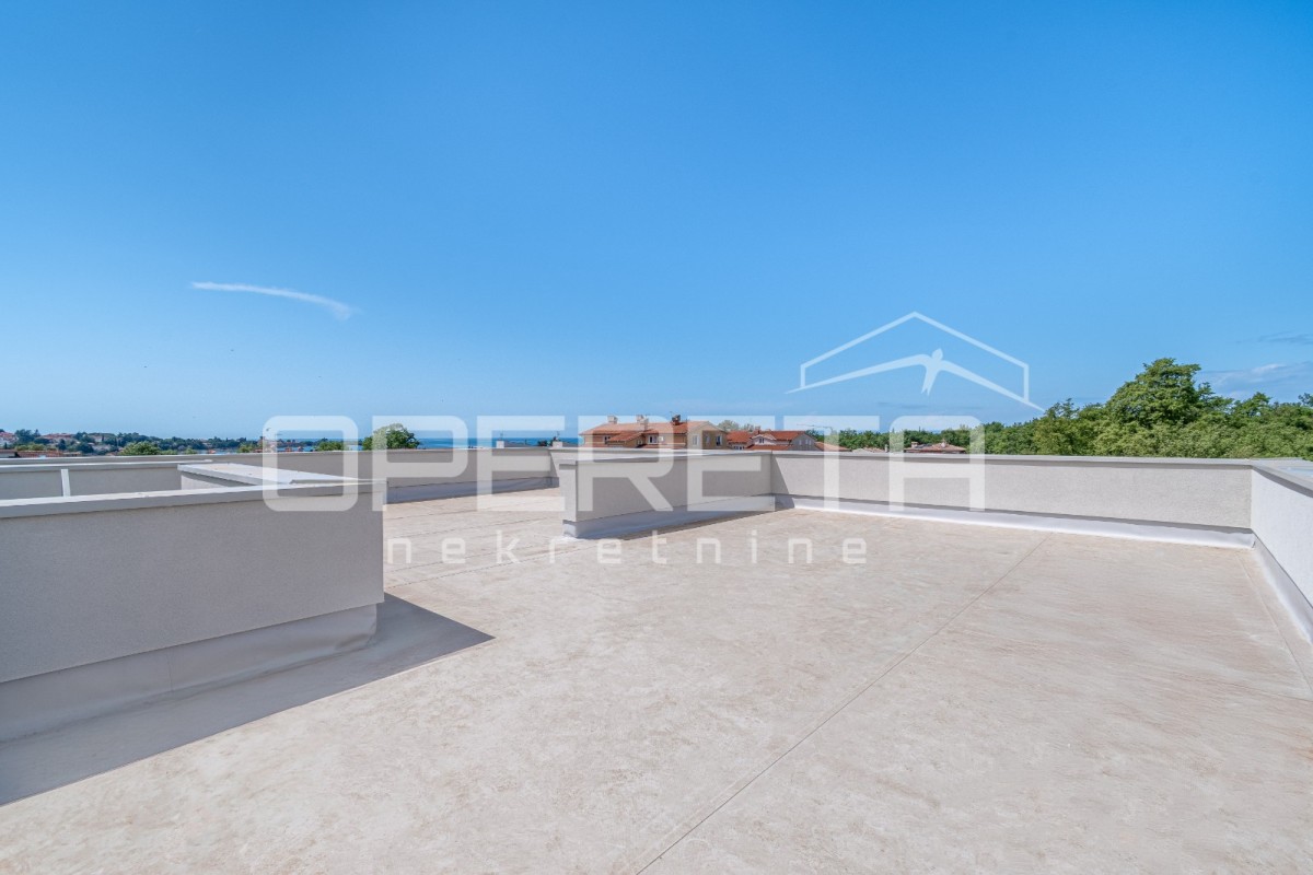 V naši ponudbi izpostavljamo vrhunsko stanovanje v prvem nadstropju 108,20 m2 in strešno teraso 112,50 m2, 300 m od morja.