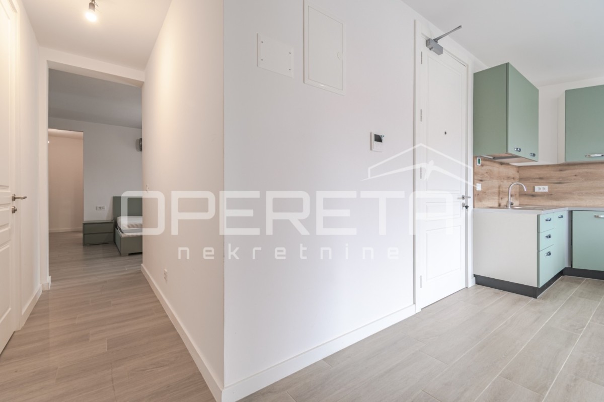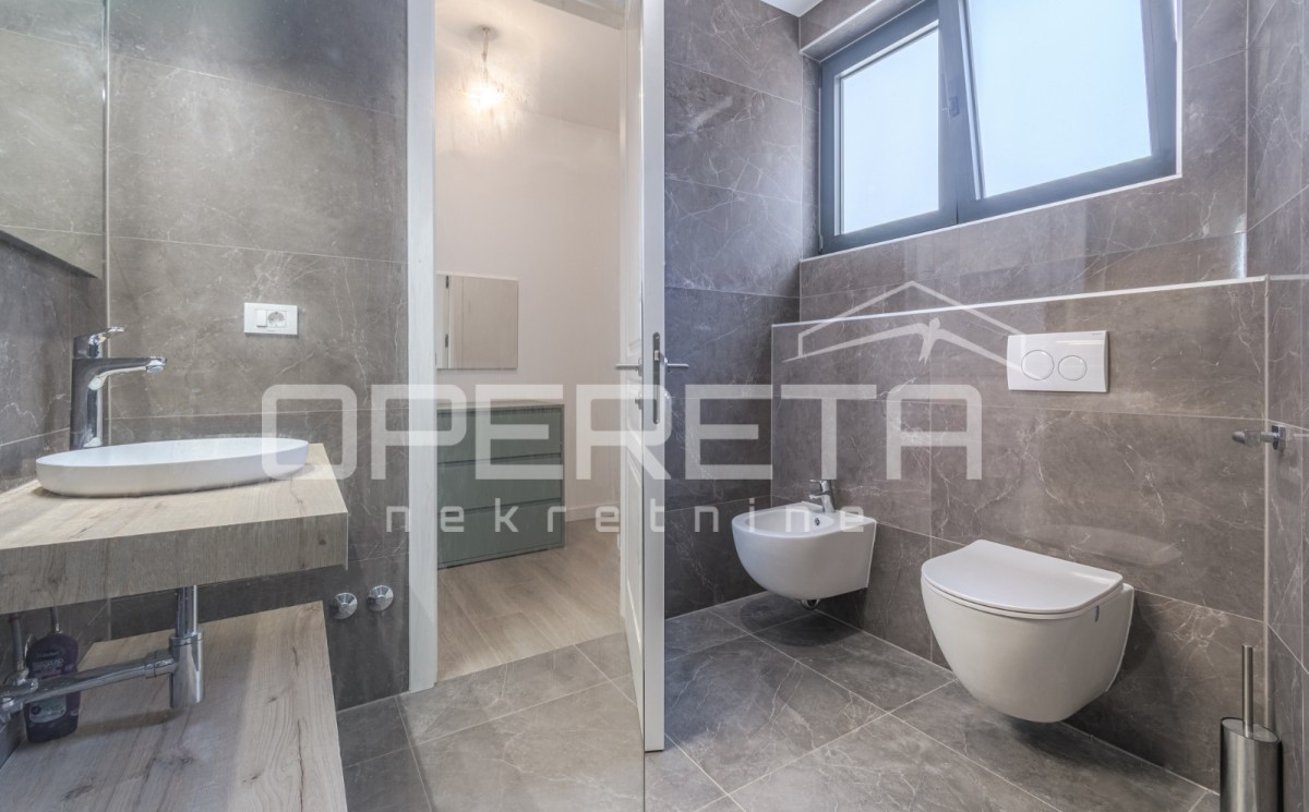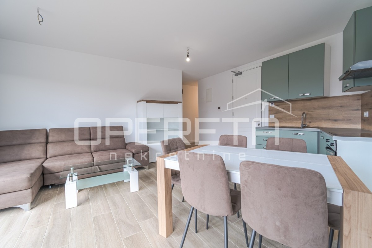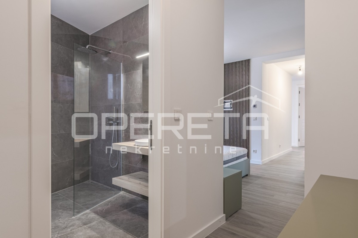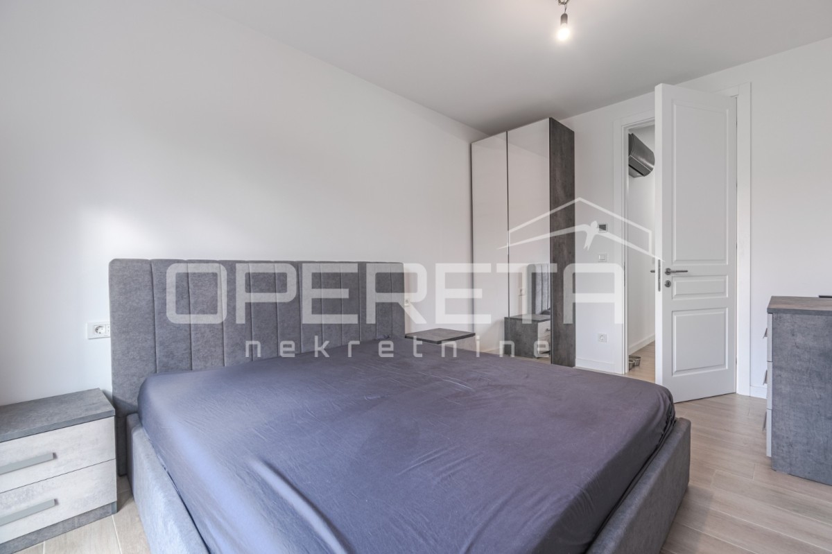 Stanovanje se sestavlja iz vhodnega hodnika, dnevnega prostora s kuhinjo in jedilnico v odprtem konceptu, z izhodom na teraso in vrt, dveh spalnic (ena z lastno kopalnico in garderobo) ter dodatne kopalnice.