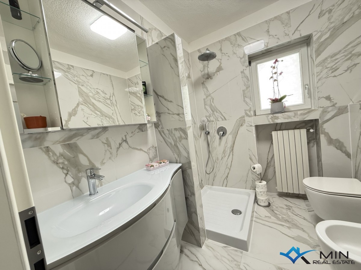 Prava priložnost za nakup stanovanja v pritličju, oddaljenega le nekaj korakov od morja in lepo urejene plaže v središču Novigrada. Stanovanje se nahaja v bližini vseh pomembnih storitev in je umeščeno na zelo iskani ter privlačni lokaciji. Stanovanje obsega 87 m2 in je sestavljeno iz prostorne dnevne sobe, kuhinje z jedilnico, dveh kopalnic, dveh spalnic (ena se trenutno uporablja kot delovni prostor) ter še ene dnevne sobe, ki ima priključke za kuhinjo. Po dokumentaciji je stanovanje vodeno kot dve manjši enoti, od katerih ima ena približno 50,80 m2, druga pa 36,27 m2, kar omogoča, da jih po želji uporabljate kot ločene enote. Prihodnji kupec te nepremičnine lahko z razdelitvijo stanovanj eno enoto uporablja zasebno, drugo pa oddaja v turistične ali dolgoročne namene. Ogrevanje in hlajenje sta zagotovljena preko centralnega ogrevanja in klimatske naprave. Pomembno je poudariti, da stanovanje razpolaga z dvema parkirnima mestoma in majhnim vrtom, kar je v središču mesta prava redkost. Oddaljenost do morja in plaže je približno 50 metrov, prav toliko je do tržnice, medtem ko je staro mestno jedro oddaljeno le 150 metrov od stanovanja.