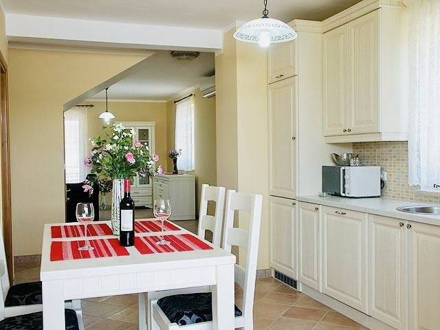 Po notranjih stopnicah se povzpnemo v prvo nadstropje, kjer so tri prostorne spalnice, idealne za družino ali goste. Kuhinja je moderno opremljena z napravami, vključno z pomivalnim in pralnim strojem, ter TV-jem, posteljo in pisalno mizo, kar omogoča udobno in funkcionalno bivanje.