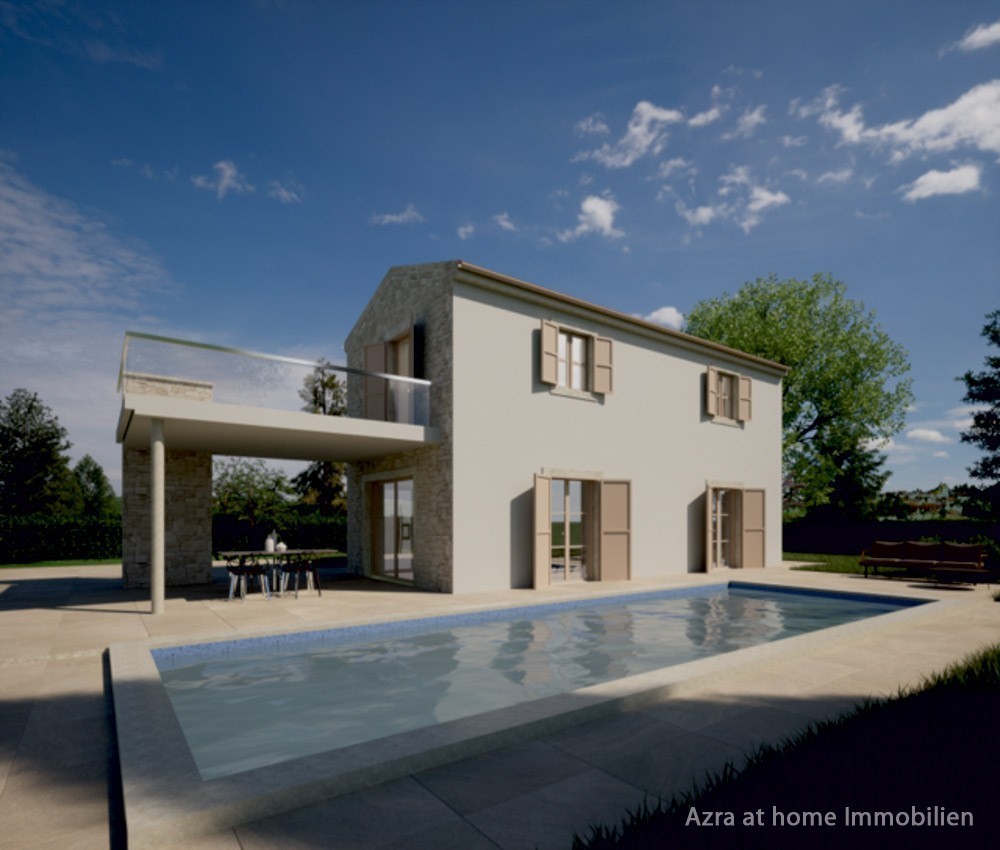 V bližini Višnjana, približno 2 kilometra od centra te slikovite vasice in le 10 kilometrov od morja, se nahaja ta sodobna hiša, ki se popolnoma ujema s tradicionalno istrsko arhitekturo in je trenutno v fazi gradnje. Neto površina hiše znaša 143,17 m2, bruto površina pa 154,55 m2. Hiša se razprostira na treh nadstropjih. V kleti s površino 29,22 m2 se nahaja prostor za sprostitev, kopalnica, strojnica in stopnišče, ki vodi do pritličja hiše. V pritličju s površino 53,76 m2 (bruto 63,43 m2) se nahaja vhod, prostorna kuhinja z dnevnim prostorom in jedilnico. Prvo nadstropje ima 60,19 m2 neto površine (bruto površina 61,90 m2) in vključuje stopnišče, hodnik ter dve spalnici, vsaka s svojo lastno kopalnico. Ena od teh spalnic ima svojo lastno teraso. Hiša je postavljena na parceli veliki 568 m2. V dvorišču se nahaja bazen s površino 35 m2. Nahaja se v mirnem okolju. Ta nepremičnina predstavlja idealno priložnost za tiste, ki iščejo združitev tradicije z luksuznimi elementi.