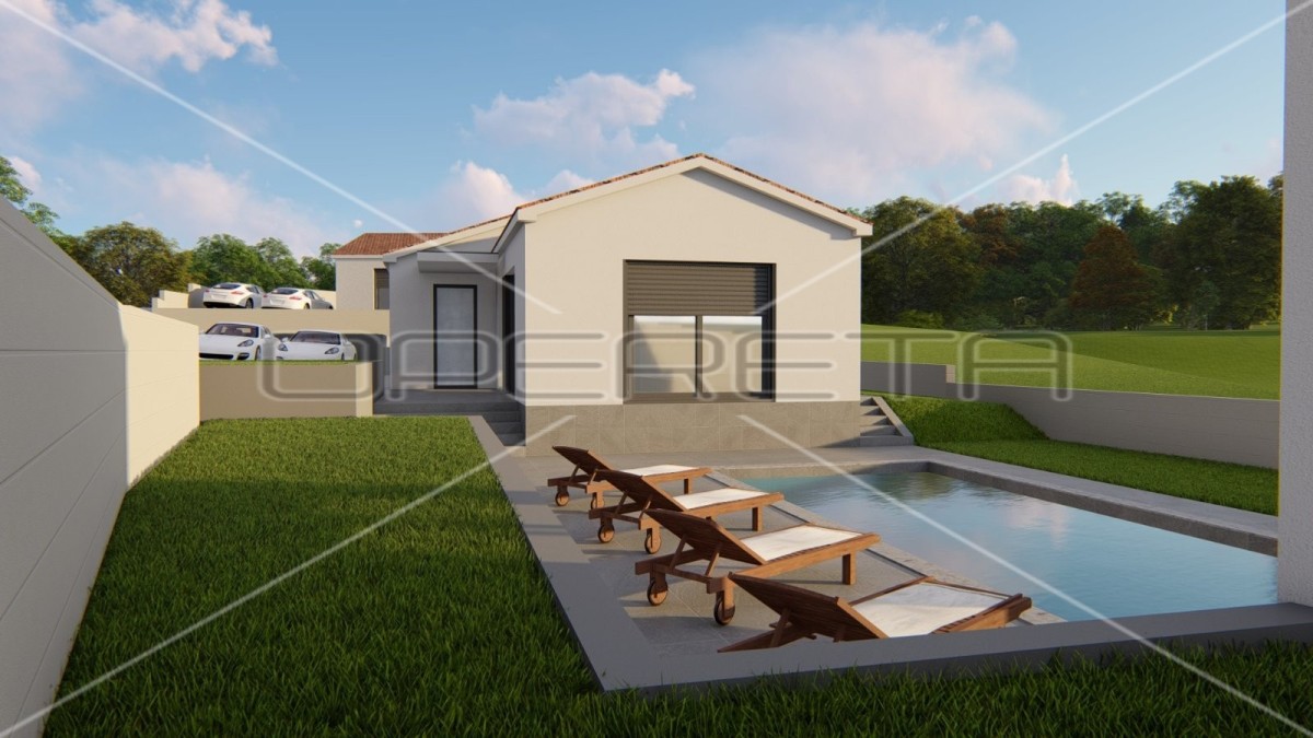 Istra, Kršan. Prodamo zazidljivo zemljišče 891 m2 v Kršanu. Zemljišče ima pravnomočno gradbeno dovoljenje, plačan DDV in komunalo za montažno enonadstropno hišo skupne bivalne površine 130,10 m2. Predvidena je gradnja glavne hiše (110,90 m2) z bazenom 25 m2 in pomožnim objektom 19,20 m2.