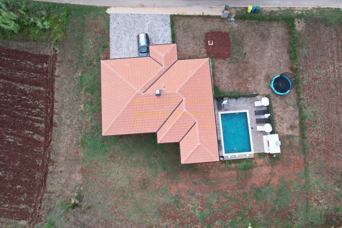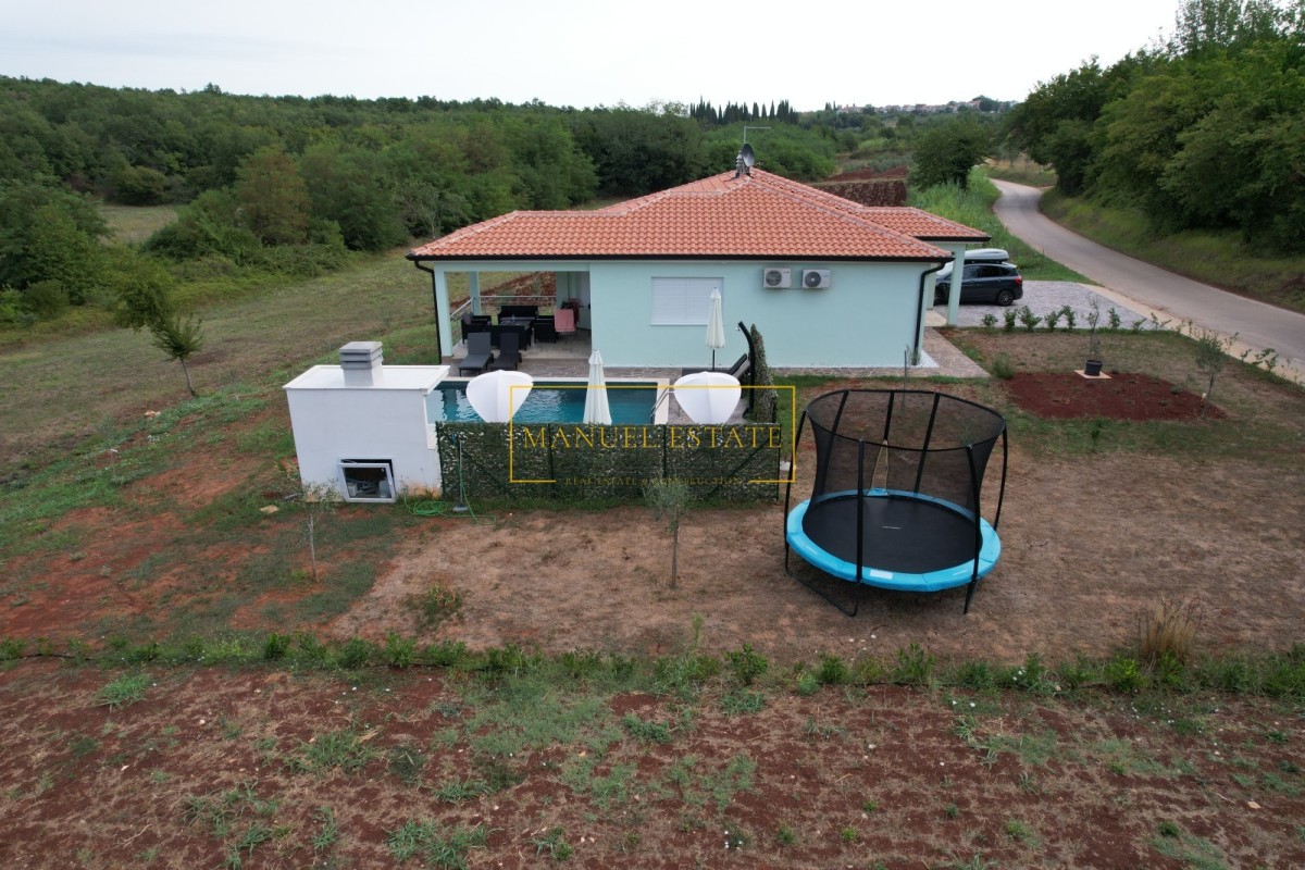 Hus med pool, nära Brtonigla, total boyta 140 m2 med en trädgård på 600 m2. Den består av en hall, ett kök, en matsal, tre sovrum, två badrum, ett förråd och ett vardagsrum med utgång till en täckt terrass med utsikt över poolen, trädgården och naturen. Toppmoderna luftkonditioneringsapparater är installerade. Trädgårdens centrum på 600 m2 består av en pool med en solterrass, en öppen spis/grill och planterade unga olivträd. Det finns möjlighet att uppgradera sommarköket och altanen. Det finns även två utomhusparkeringsplatser på gården. Huset byggdes 2020, det ligger i ett lugnt läge, ca 1 km från centrum av Brtonigla, och ca 5 km från havet och välskötta stränder. Umag ligger 7 km bort och Novigrad ligger 8 km bort. För all annan information, kontakta oss gärna.